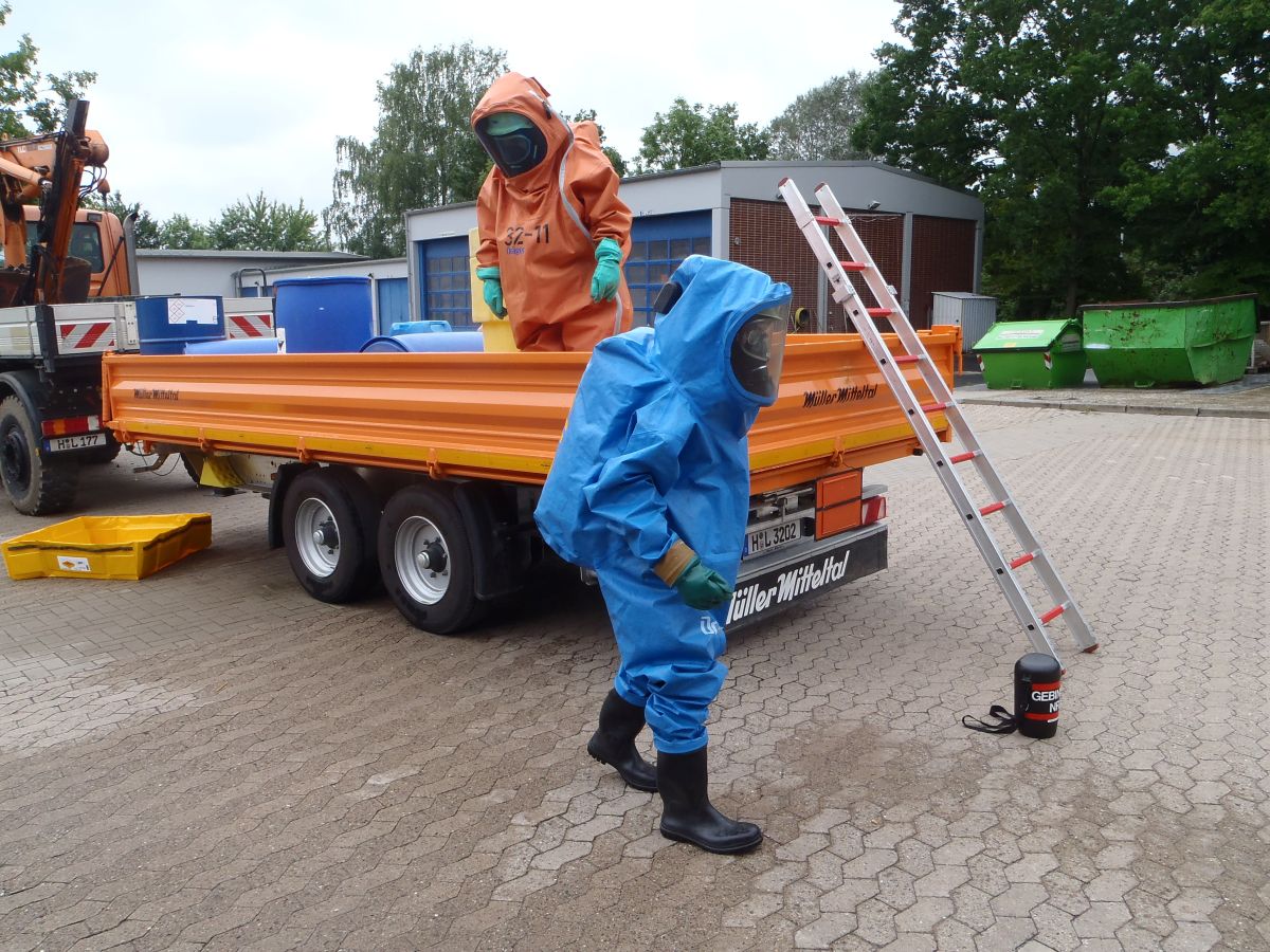 Gegen Mittag wurde es dann "ernst", der Gefahrgutzug setzte sich in Richtung Karlsruher Straße in Bewegung. Auf dem Betriebshof der Stadt Laatzen war es bei Verladearbeiten zum Austritt von "grüner gefährlicher Flüssigkeit" gekommen, mehrere Behälter sind Leck geschlagen, dieses Szenario schilderten Übungsleiter Frederik Mohr und Marc Schultze den anrückenden Feuerwehrleuten. Von den Pattenser Kräften wurde sofort eine Luft gestützte Dekontaminationseinheit aufgebaut, im Einsatzfall könnten hier Verletzte und Helfer gereinigt werden. Ein 5000 Liter fassender Faltbehälter fängt des kontaminierte Wasser dann auf. Ferner ist auch ein "normales Duschen" möglich, erklärte Hans-Peter Genath, Gefahrgutbeauftragter der Pattenser Feuerwehr. Von der Laatzener Feuerwehr wurde umgehend eine "Crash-Rettung" der beiden Arbeiter an dem Fahrzeug eingeleitet und diese anschließend dekontaminiert. Unter CSA (Chemikalienschutzanzug) sichteten mehrere Trupps die Fässer und dichteten diese ab. Eine einfache Art die beschädigten Fässer zu sichern, war das Aufrichten mit dem beschädigten Teil nach oben, so kann kaum noch etwas auslaufen. Bei den Arbeiten an dem Unfallfahrzeug waren Trupps unter CSA von beiden Feuerwehren im Einsatz. Insgesamt waren vier defekte Fässer abzudichten und zwei Dummys zu retten. Nach dem Abbau trafen sich die Helfer noch zu einem Feedback und der "Manöverkritik".