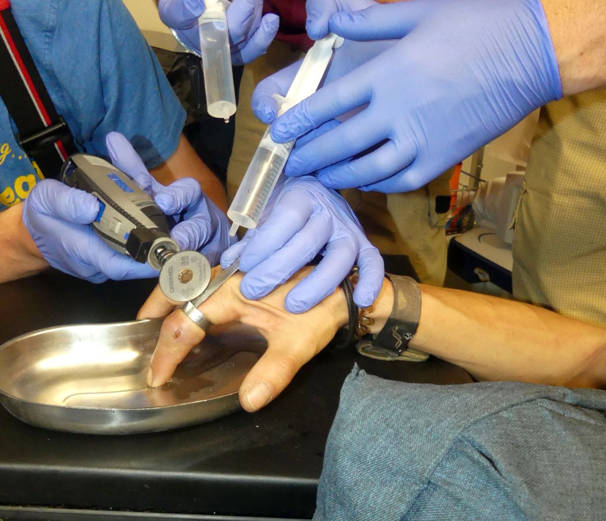 Mit neun Einsatzkräften und einem Hilfeleistungslöschfahrzeug waren die Retter wenige Minuten später vor Ort. Ein dicker, großer und breiter Metallring steckte an einem angeschwollenen Finger der rechten Hand eines Mannes. Mit einem sogenannten „Dremel“ frästen die Helfer langsam, aber sicher das Metallteil auseinander. Immer wieder wurde dabei mit Spritzen kaltes Wasser zum kühlen auf den Finger bzw. die „Sägestelle“ geträufelt. Gegen 20 Uhr war der Ring einmal durchtrennt, ließ sich aber leider mit Zangen nicht auseinander biegen. Ein weiterer „Schnitt“ war erforderlich. Um 20.20 Uhr war der Ring in zwei Stücke zerteilt. Ein Kühlpack sorgte für reichlich Kühlung des angeschwollenen Fingers.