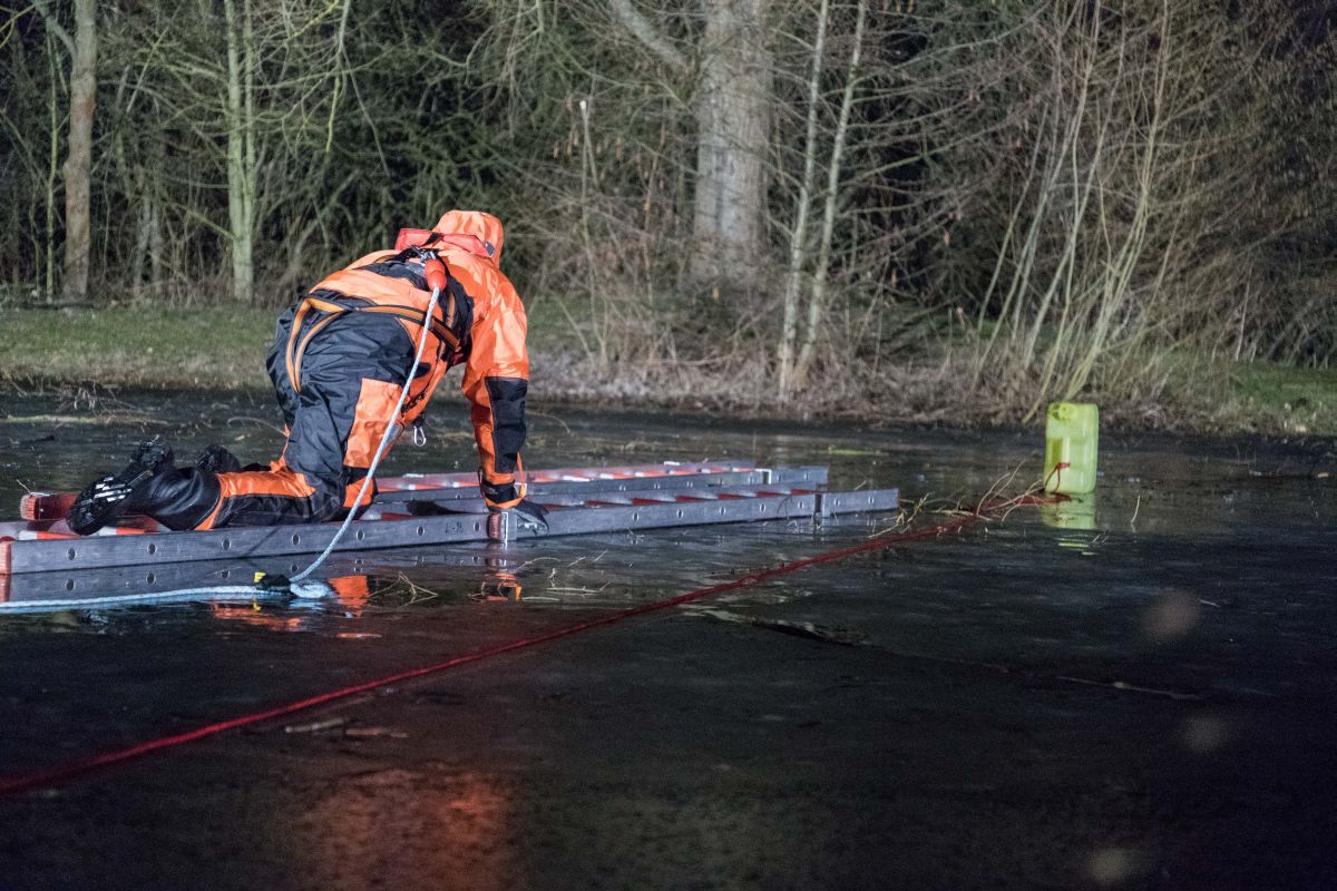 Damit im Einsatzfall schnellstmöglich geholfen werden kann, übt die Feuerwehr insbesondere vor und in den Wintermonaten regelmäßig das Anlegen der Überlebensanzüge sowie den Einsatz des Eisretters. Nicht nur mit dem Eisretter, sondern auch mit den Steckleiternteilen als vergrößerte Auflagefläche kann eine Person gerettet werden. Deshalb wurde dieses Vorgehen bei dem rund 90-minütigen Übungsdienst ebenfalls geübt.