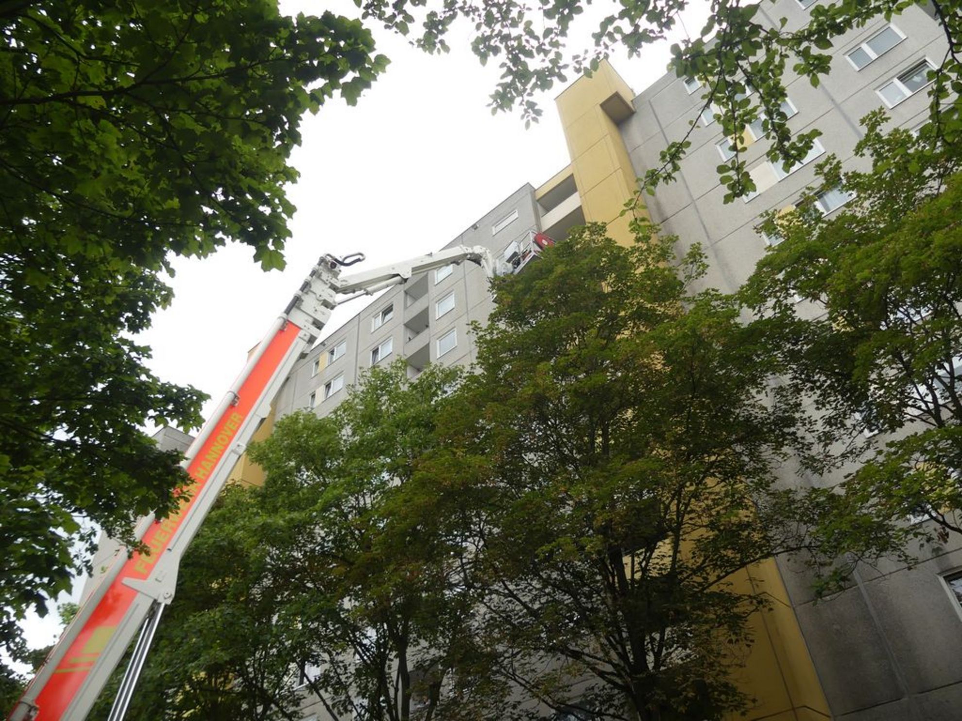 In Laatzen-Mitte war im 7. Obergeschoss eines Hochhauses ein Mann aus dem Bett gefallen. Nun galt es diesen patientenschonend zum Rettungswagen zu transportieren. Da dieses wegen der Höhe sowie diverser Äste von Bäumen mit der Laatzener Drehleiter nicht möglich war, wurde die Berufsfeuerwehr Hannover um Unterstützung gebeten. Die Beamten aus der Nachbarkommune rückten mit ihrer Teleskobmastbühne an. Das große 3-achsige-Spezialfahrzeug wurde genau vor dem Haus aufgestellt. Mit seinen bis zu 54 Metern Arbeitshöhe erreichte der Korb über die Baumkronen hinweg das 7. Obergeschoss problemlos. Vorher hatten die Retter aus Laatzen schon etliche Zweige und Äste mit der Motorkettensäge entfernt, um den Einsatz zu erleichtern. Gegen 18 Uhr war der Patient im Rettungswagen. Dieser brachte ihn in ein Krankenhaus.