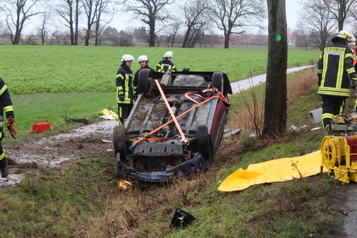 Das Auto hat sich bei dem Unfall überschlagen und liegt nun auf dem Dach im Graben zwischen der Straße und dem Radweg. Die Straße ist voll gesperrt. Ortskundige sollten den Bereich weiträumig umfahren.