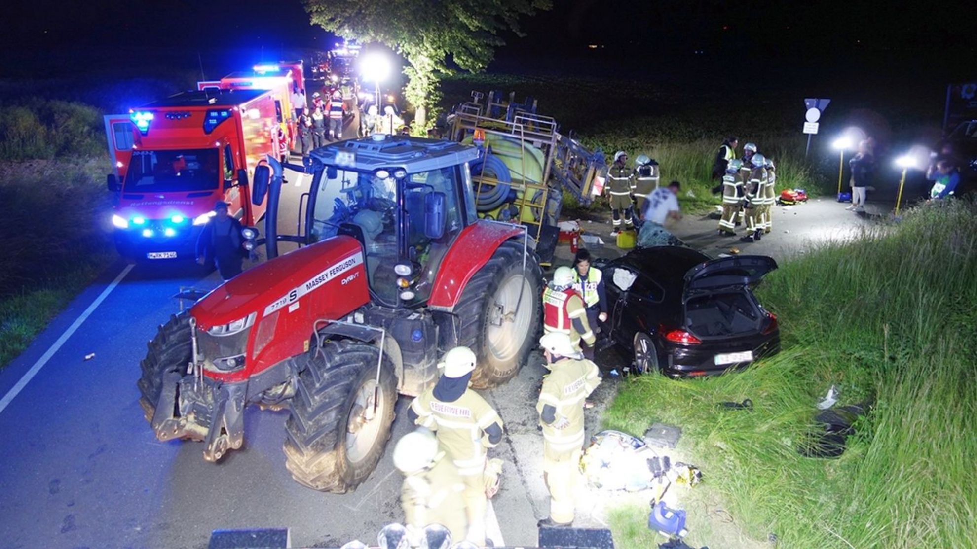 Ein PKW und ein Traktorgespann sind kollidiert. Bei dem Verkehrsunfall wurden insgesamt sechs Personen verletzt. Fünf davon schwer. Bei Eintreffen der ersten Einsatzkräfte wurde die Lage erkundet und die Verletzten betreut. Eine Person musste mittels hydraulischen Rettungsgeräts aus dem völlig zerstörten PKW befreit werden. Aufgrund der hohen Verletztenanzahl wurde MANV ausgelöst. MANV bedeutet Massenanfall an Verletzten. Hier wird zusätzlich zu den üblichen Rettungsmittel weitere Einsatzkräfte wie den technischen Leiter Rettungsdienst und einen leitenden Notarzt zur Einsatzstelle gerufen. Insgesamt befanden sich sechs Rettungswagen sowie sechs Notarztfahrzeuge an der Einsatzstelle. Neben der Verletztenbetreuung wurde auch die Einsatzstelle ausgeleuchtet. Ein vorbereiteter Löschangriff sorgte für den Brandschutz. Weiterhin wurde Betriebsflüssigkeiten abgestreut.