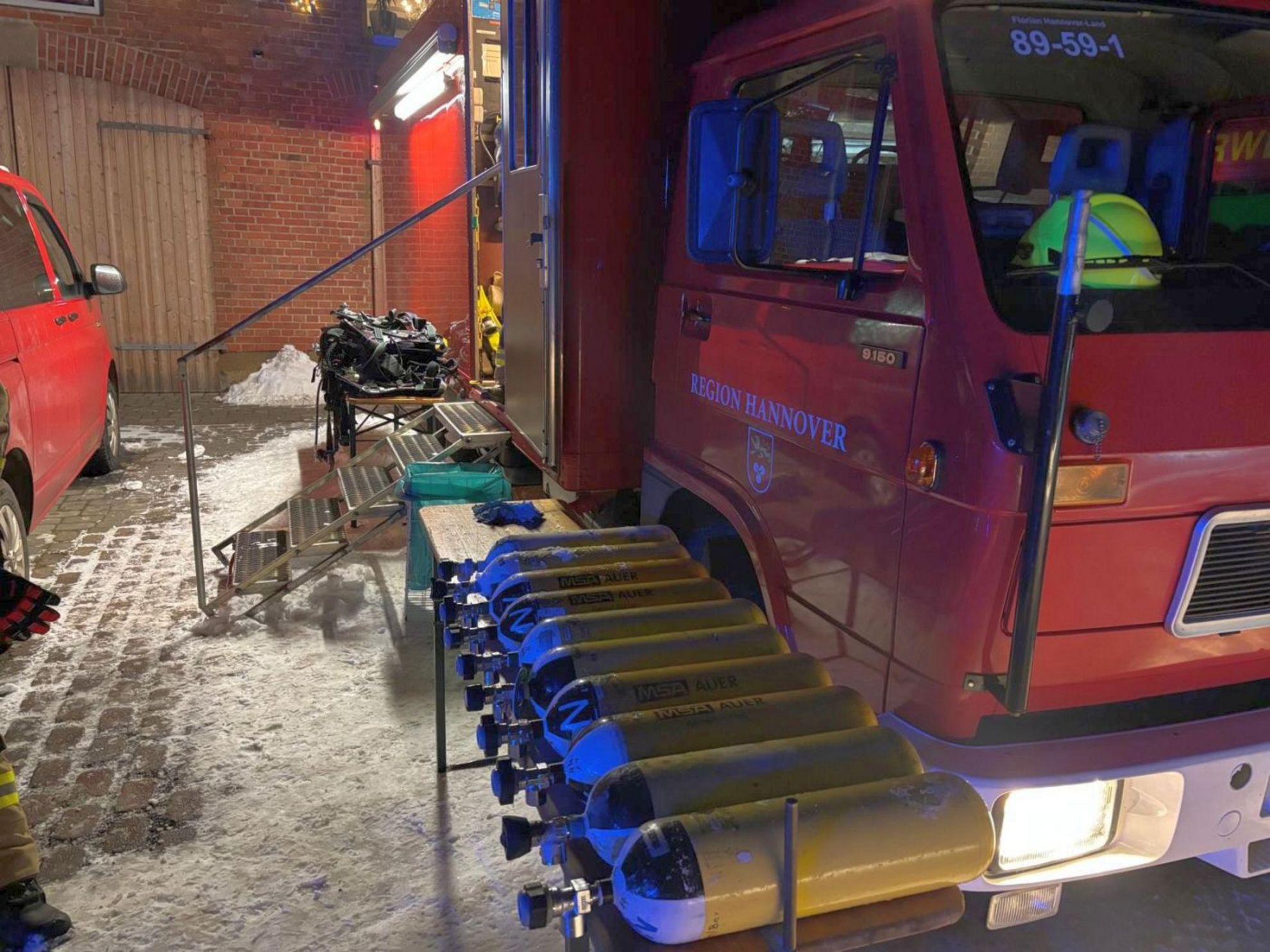 Vor Ort wurden verbrauchte Atemluftflaschen der eingesetzten Trupps wieder aufgefüllt, um die Einsatzbereitschaft der örtlichen Feuerwehren aufrechtzuerhalten. Zudem tauschten die Einsatzkräfte Atemschutzmaterialien aus, um einen sicheren und kontinuierlichen Innenangriff zu gewährleisten.