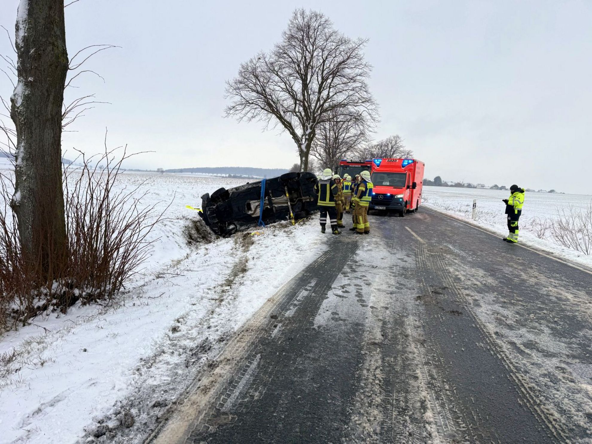 Vor Ort stellte sich heraus, dass sich ein Pkw überschlagen hatte. Die Feuerwehren betreuten die Personen bis zum Eintreffen des Rettungsdienstes und übergaben diese anschließend an diesen. Aufgrund auslaufender Betriebsflüssigkeiten wurde die untere Wasserbehörde verständigt.