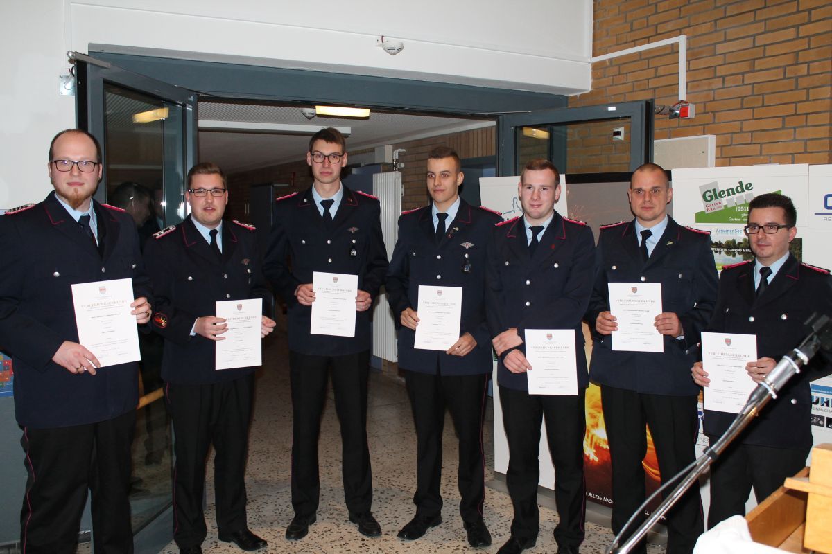 Befördert wurden Tobias Wirth, Nikodem Roszak, Kathrin Frömberg und Daniel Bähre zu Oberfeuerwehrmännern. Den Titel Hauptfeuerwehrman erhielten Jens Pardey, Kilian Luther und Kai Kruskop. Dennis Boßdorf wurde zum Löschmeister befördert und sein Kamerad Sebastian Schlund zum Oberlöschmeister. Die Einsatzabteilung übernahm aus der Jugendfeuerwehr Timo Bensler, Robin Lüerßen, Niklas Räcker, Kilian Schwarz, Lilly Sophie Volkmann, Moritz Weise und Alexander Wiesner. Fünf von ihnen waren ehemalige Löschteufel (Kinderfeuerwehr). Das Landesfeuerwehrverbandabzeichen für 25 Jahre erhielten Ulrich Weber und Sigismund Neumann. Besonderen Applaus und Anerkennung von allen Beteiligten gab es für Rolf Gramann Senior, der die Verleihung des Landesfeuerwehrverbandabzeichen für 70 Jahre erhielt.