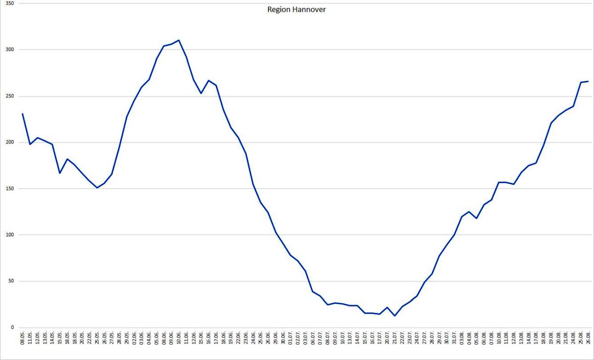 Die Region Hannover hat seit Auftreten der ersten Corona-Infektion insgesamt 3.307 Menschen registriert, die sich in der Region mit dem Coronavirus infiziert haben (+19 verglichen zur letzten Meldung). Davon sind zum heutigen Stand 2.920 Personen als genesen aufgeführt. 121 Menschen sind infolge einer nachgewiesenen oder mutmaßlichen Corona-Infektion in der Region verstorben; der Altersdurchschnitt der Verstorbenen liegt bei 82 Jahren. Somit sind zum jetzigen Zeitpunkt 266 Menschen in der Region infiziert.