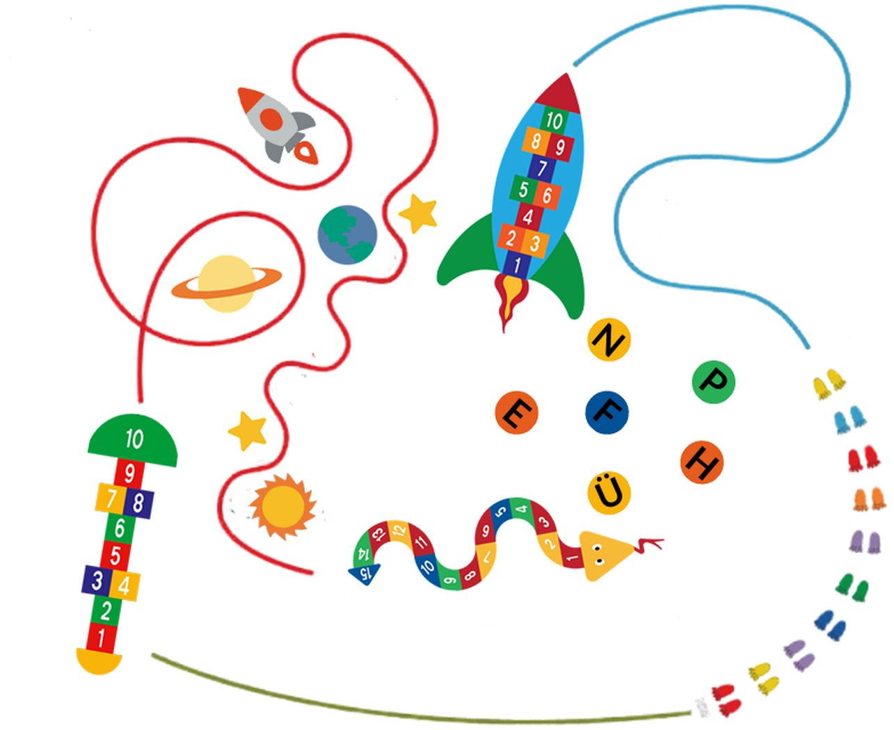 Das Bewegungsspiel zeichnet sich durch eine lebendige und ansprechende Farbgestaltung aus, die nicht nur optische Akzente setzt, sondern auch Kreativität und Spielfreude fördert.