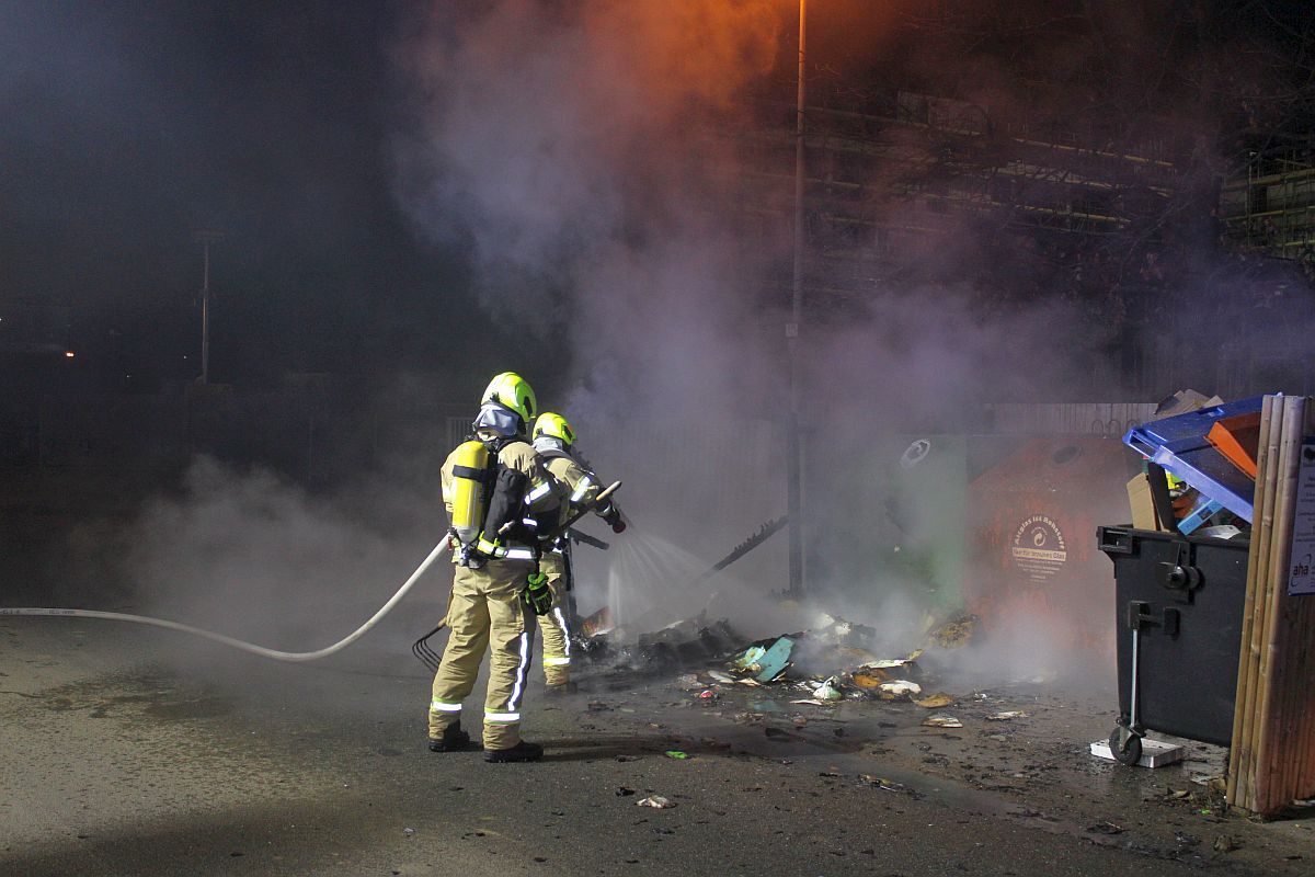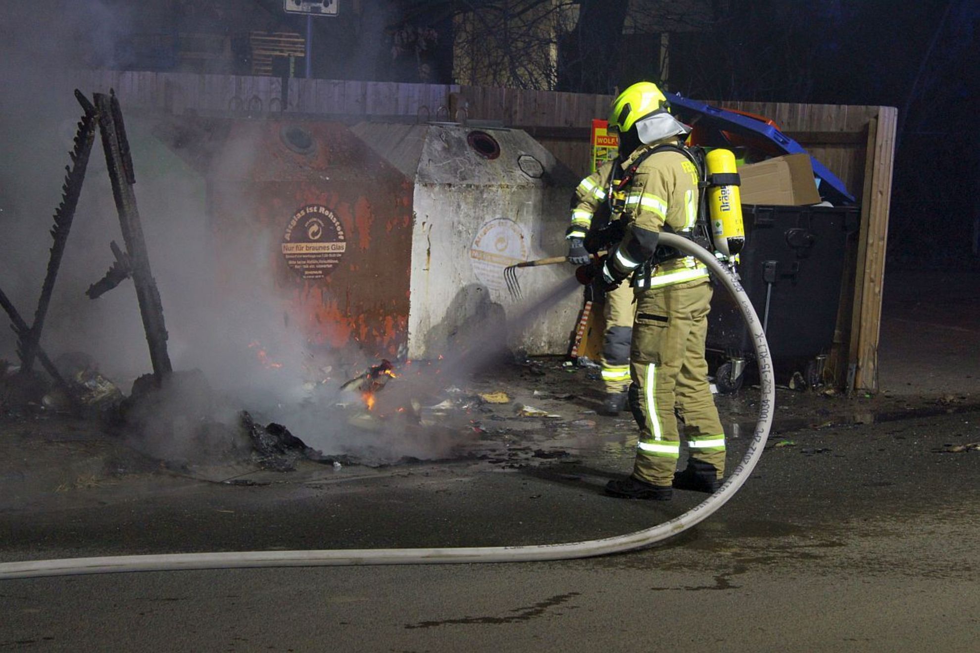Zu einem brennenden Papiercontainer auf einem Müllsammelplatz wurde die Ortsfeuerwehr Laatzen heute um 0.19 Uhr in die Mergenthalerstraße (Höhe Gutenbergstraße) in Laatzen gerufen. Die Flammen wurden durch einen Trupp unter schwerem Atemschutz mit reichlich Wasser zügig gelöscht. Der Papiercontainer, der aus Kunststoff bestand, schmolz bei dem Brand zusammen und wurde vollständig zerstört. Auch ein kleinerer Teil des hölzenernen Zauns, der den Müllsammelplatz umrahmte, wurde durch die Flammen zerstört. Ein Übergreifen des Feuers auf die weiteren Müllcontainer auf dem Müllsammelplatz und den größten Teil des Zaunes konnte durch das schnelle Eingreifen der Feuerwehr verhindert werden. Vor Ort waren neun ehrenamtliche Einsatzkräfte der Ortsfeuerwehr Laatzen und zwei Polizeibeamte mit einem Streifenwagen. Nach einer guten halben Stunde konnten die Einsatzkräfte wieder einrücken.