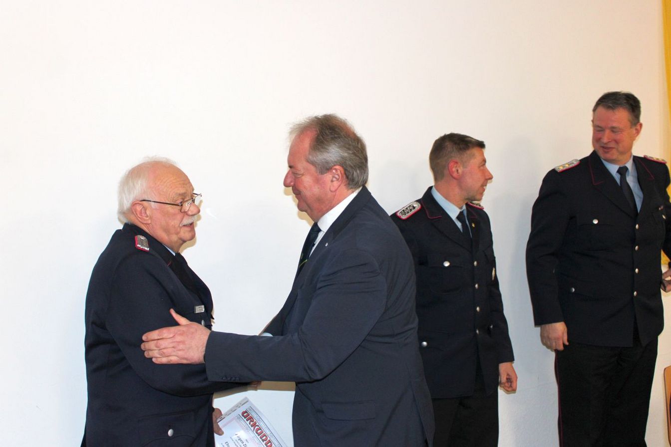 Da es in der diesjährigen Versammlung keine Beförderungen gab, leitete Engelmann direkt zum Tagesordnungspunkt Ehrungen über. Cord Hennies wurde für 40 Jahre Mitgliedschaft in der Feuerwehr geehrt. Zudem wurde Ehrenbrandmeister Jürgen Zingler (70) nach einstimmiger Zustimmung der Kameraden zum Ehrenmitglied ernannt.