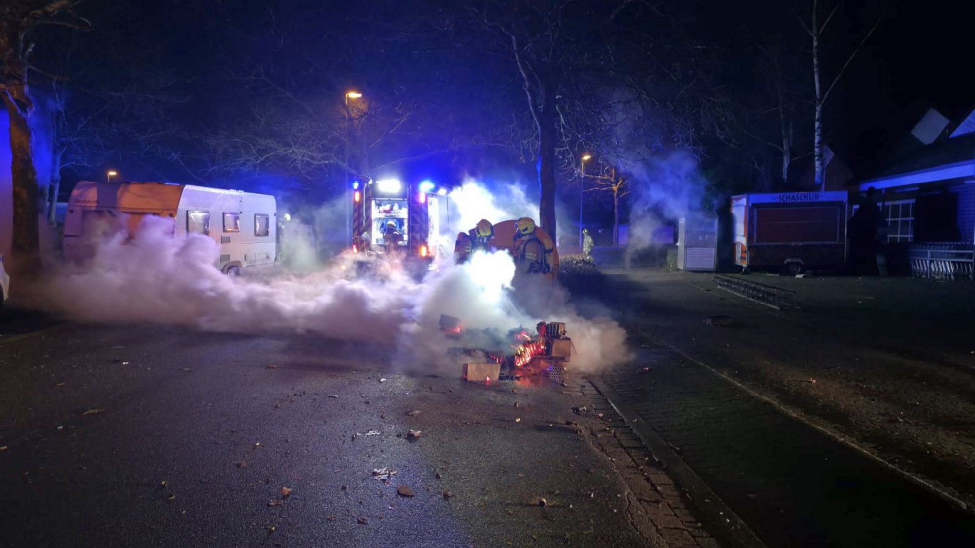Zum letzten Einsatz dieser Nacht wurde die Ortsfeuerwehr Laatzen um 2.56 Uhr alarmiert. Im Kreuzungsbereich Debberode / Lange Weihe brannten am Straßenrand zusammengetragene, abgefeuerte Feuerwerksbatterien. Feuerwehrwehrleute unter Atemschutz löschten auch diese mit Wasser ab.