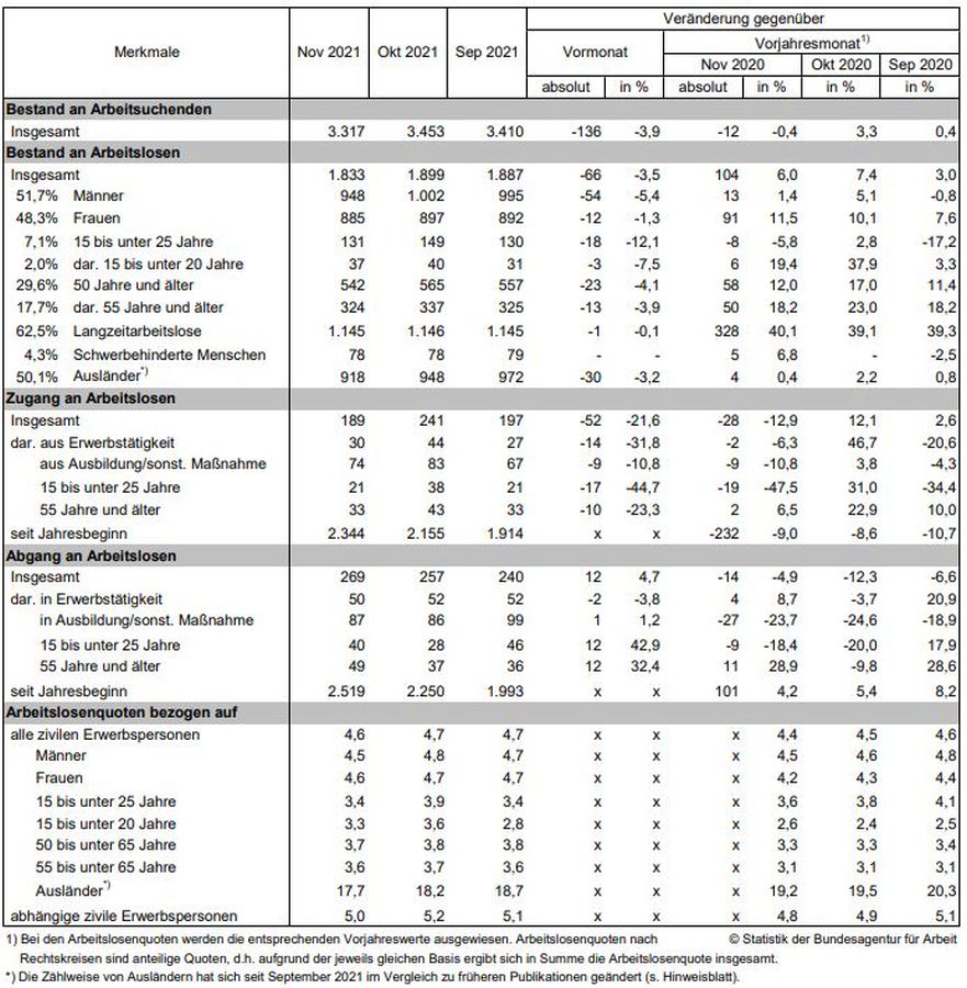 Die Arbeitslosigkeit hat sich im Rechtskreis SGB II von Oktober auf November um 66 auf 1.833 Personen verringert. Das waren 104 Arbeitslose mehr als vor einem Jahr. Die anteilige SGB II-Arbeitslosenquote auf Basis aller zivilen Erwerbspersonen betrug im November 4,6%; vor einem Jahr belief sie sich auf 4,4%. Dabei meldeten sich 189 Personen (neu oder erneut) arbeitslos, 28 weniger als vor einem Jahr. Gleichzeitig beendeten 269 Personen ihre Arbeitslosigkeit, 14 weniger als vor einem Jahr. Seit Beginn des Jahres gab es 2.344 Arbeitslosmeldungen, das ist ein Minus von 232 im Vergleich zum Vorjahreszeitraum; dem stehen 2.519 Abmeldungen von Arbeitslosen gegenüber (+101).