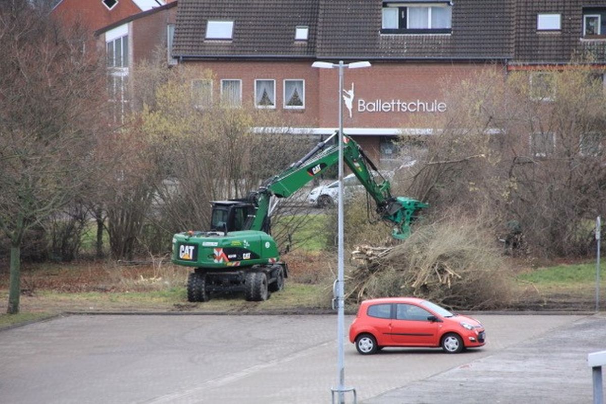 Seit heute Morgen werden die Büsche und Bäume auf der Grünfläche an Volkers Hof entfernt. Dort soll Platz geschaffen werden für das Ausstellungszelt der Mobilitäts- und Wirtschaftsschau, die am 20. und 21. Mai stattfinden wird. Wie Bürgermeister Marc Lahmann in einem Schreiben an die Naturschützerin Hannelore Owens mitgeteilt hat, werden die Büsche und Bäume vom Fußweg bis 30 Meter in das Grundstück entfernt. Nach seiner Aussage bleibt damit ein deutlicher Grünzug vor der Bebauung erhalten. „Wie auch im Bauausschuss dargestellt, werden wir entsprechende Ersatzpflanzungen forcieren“, heißt es in dem Schreiben weiter.