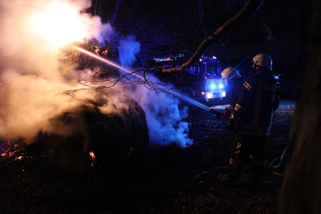 Hüpede. Rund 60 Feuerwehrleute mit 10 Fahrzeugen waren am Samstag, 28. Februar, ab ca. 20.45 Uhr im Einsatz um einen Strohballenbrand im Wald in der Gemarkung Hüpede, zwischen Hüpede und Gestorf zu löschen.