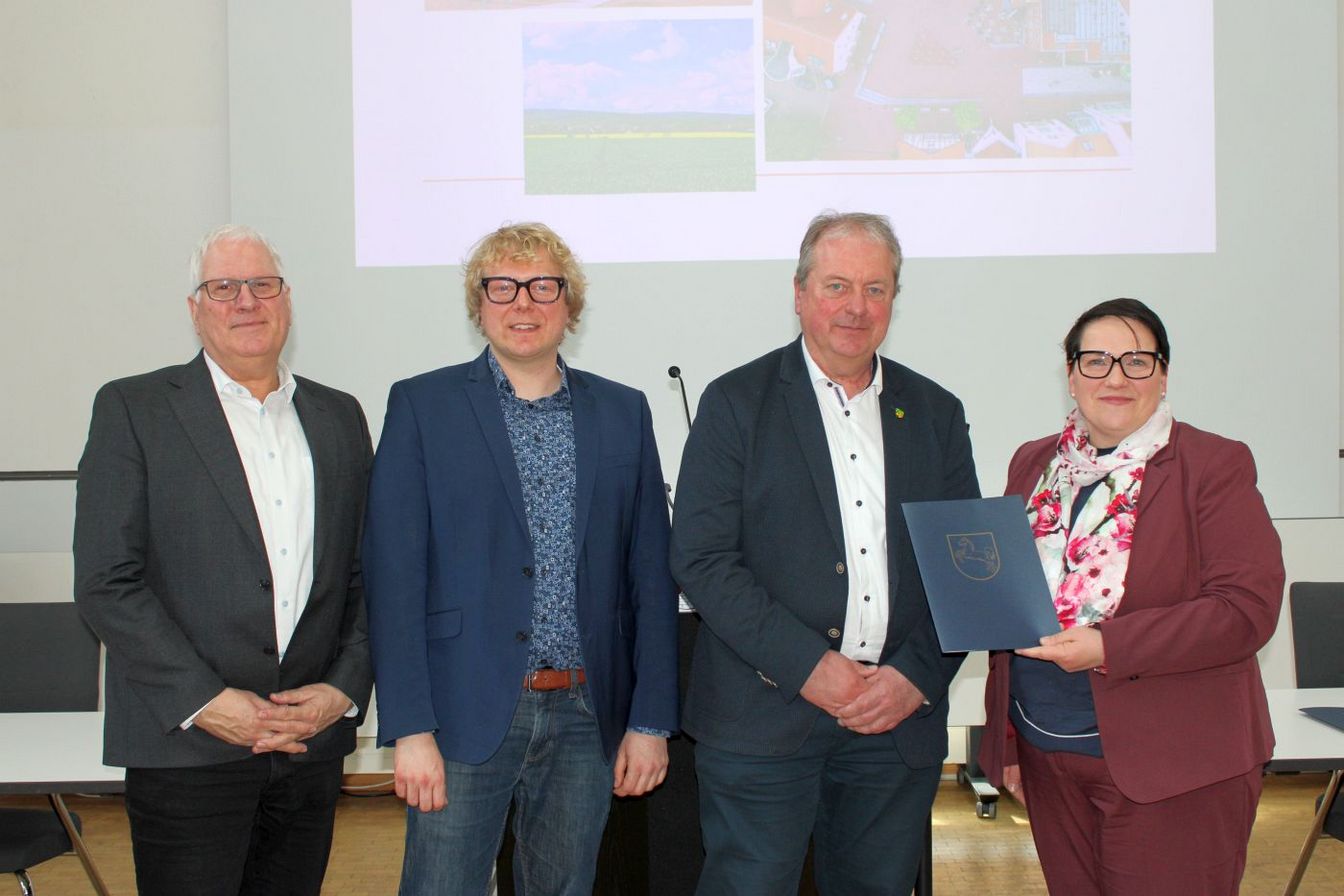 Bescheidübergabe an Barsinghausen: (v.l.) Ottmar von Holtz, Landesbeauftragter Amt für regionale Landesentwicklung, Timo Muchow, Bürgermeister Henning Schünhof und Ministerin Melanie Walter.