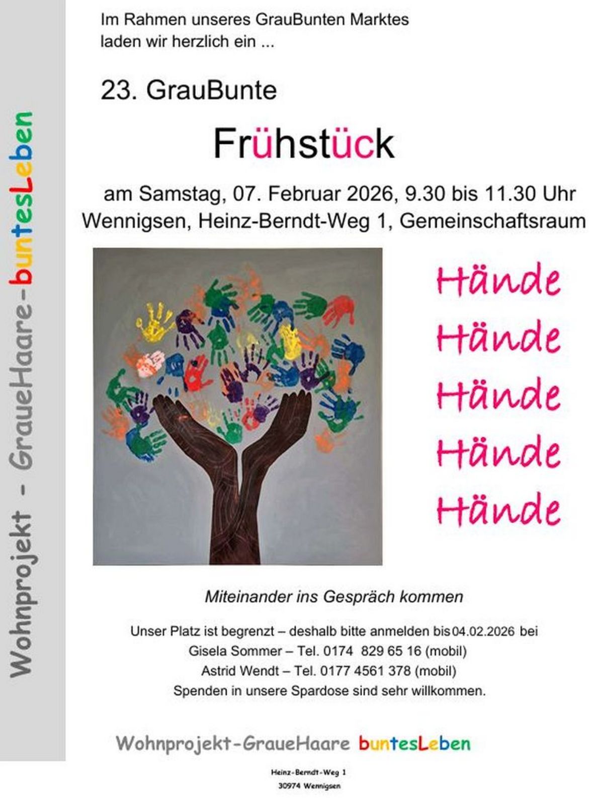 Wennigsen. Im Rahmen des GrauBunten Marktes lädt das Wohnprojekt „Graue Haare – buntes Leben“ herzlich zum 23. GrauBunten Frühstück ein. Die Veranstaltung findet am Samstag, den 7. Februar, von 9.30 bis 11.30 Uhr im Gemeinschaftsraum, Heinz-Berndt-Weg 1 in 30974 Wennigsen, statt