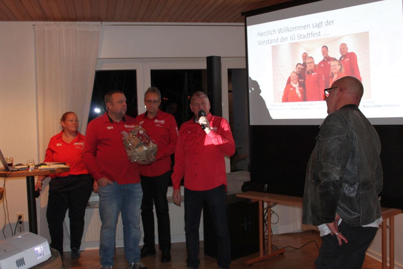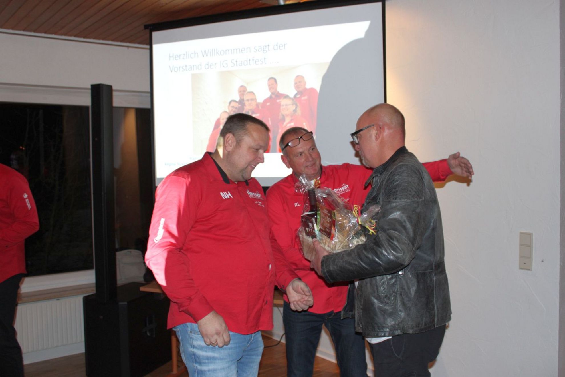 „Wir bedanken uns bei Torsten Sander für die letzten vier Jahre im Vorstand“, dankte Dreyer bei der Übergabe eines kleinen Geschenks an Sander. „Aus privaten und beruflichen Gründen lässt sich dieses zeitintensive Ehrenamt nicht mehr mit Job und Familie vereinbaren“, so Sander. „Ich danke aber allen Sponsoren und dem Team für die Unterstützung in den letzten vier Jahren.“ Sander bleibt dem Stadtfest dennoch eng verbunden: Er wird weiterhin Teil des Organisationsteams sein und die IG Stadtfest mit Rat und Tat unterstützen.