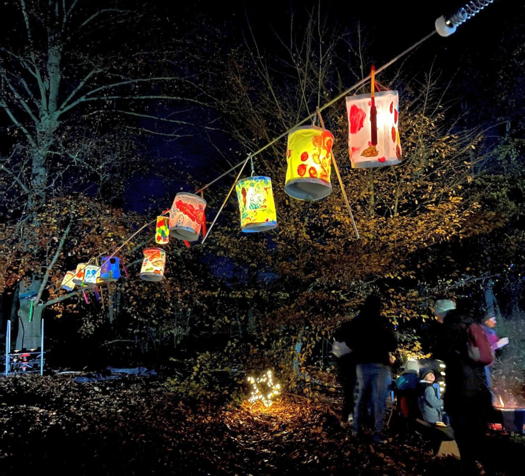 In diesem Jahr wurden unter dem Thema „Das kleine Blau trifft das kleine Gelb“ fleißig Farben gemischt und viel experimentiert. Das Ergebnis waren wunderschön bunt leuchtende Laternen, die den Wald erhellten. Aber nicht nur die Laternen der Kinder leuchteten, sondern auch die vielen bunten Windlichter, die den Weg des Laternenumzuges säumten. Natürlich wurde auch wieder viel gesungen und sogar ein wenig getanzt.