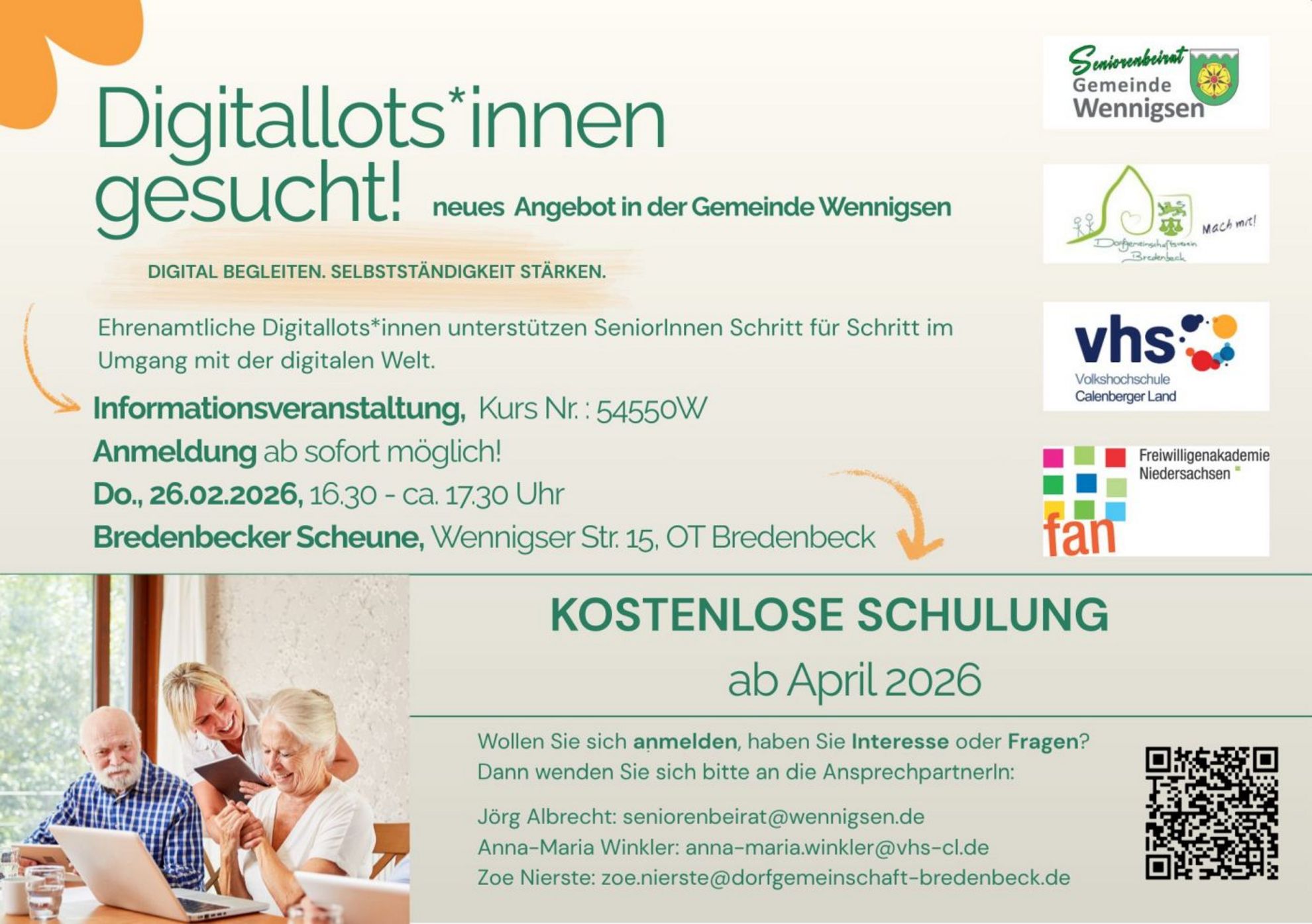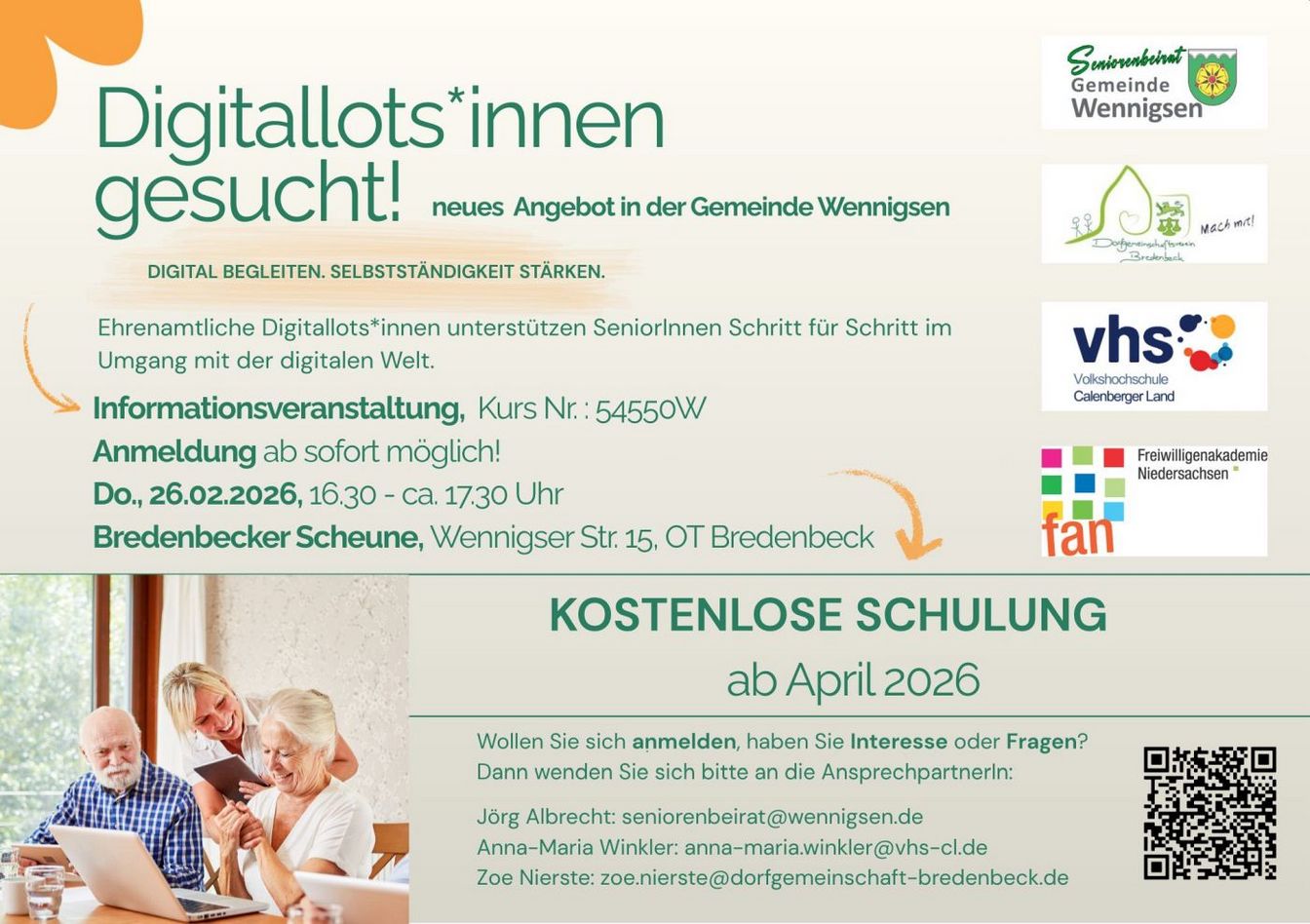 Bredenbeck. Die Digitallotsen-Qualifizierung richtet sich an Ehrenamtliche, die Senioren beim Umgang mit Smartphones unterstützen möchten. In der praxisnahen Schulung lernen die Teilnehmer grundlegende Smartphone-Funktionen, typische Alltagssituationen sowie didaktische und kommunikative Methoden, um Wissen verständlich und geduldig zu vermitteln. Ziel ist es, Digitallotsen auf ihren Einsatz in Mediencafés, Sprechstunden oder Einzelberatungen vorzubereiten und ältere Menschen auf Augenhöhe digital zu begleiten. Das Projekt ist eine Kooperation der VHS Calenberger Land, des Seniorenbeirats Wennigsen, der Freiwilligenakademie Niedersachsen und des Quartiersmanagements Bredenbeck.