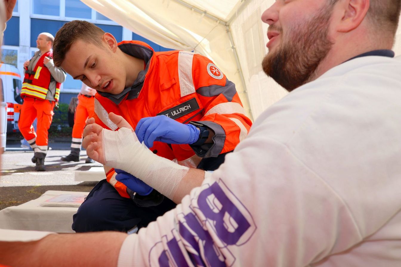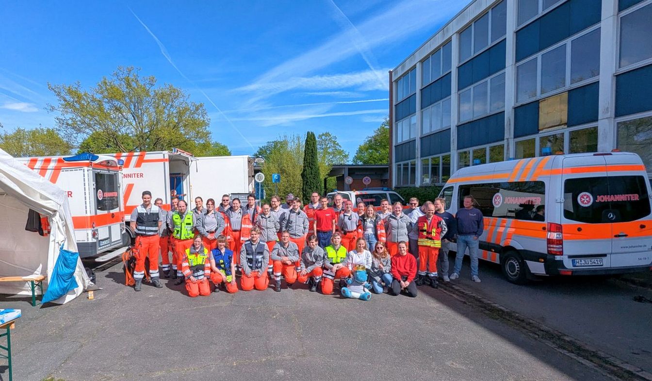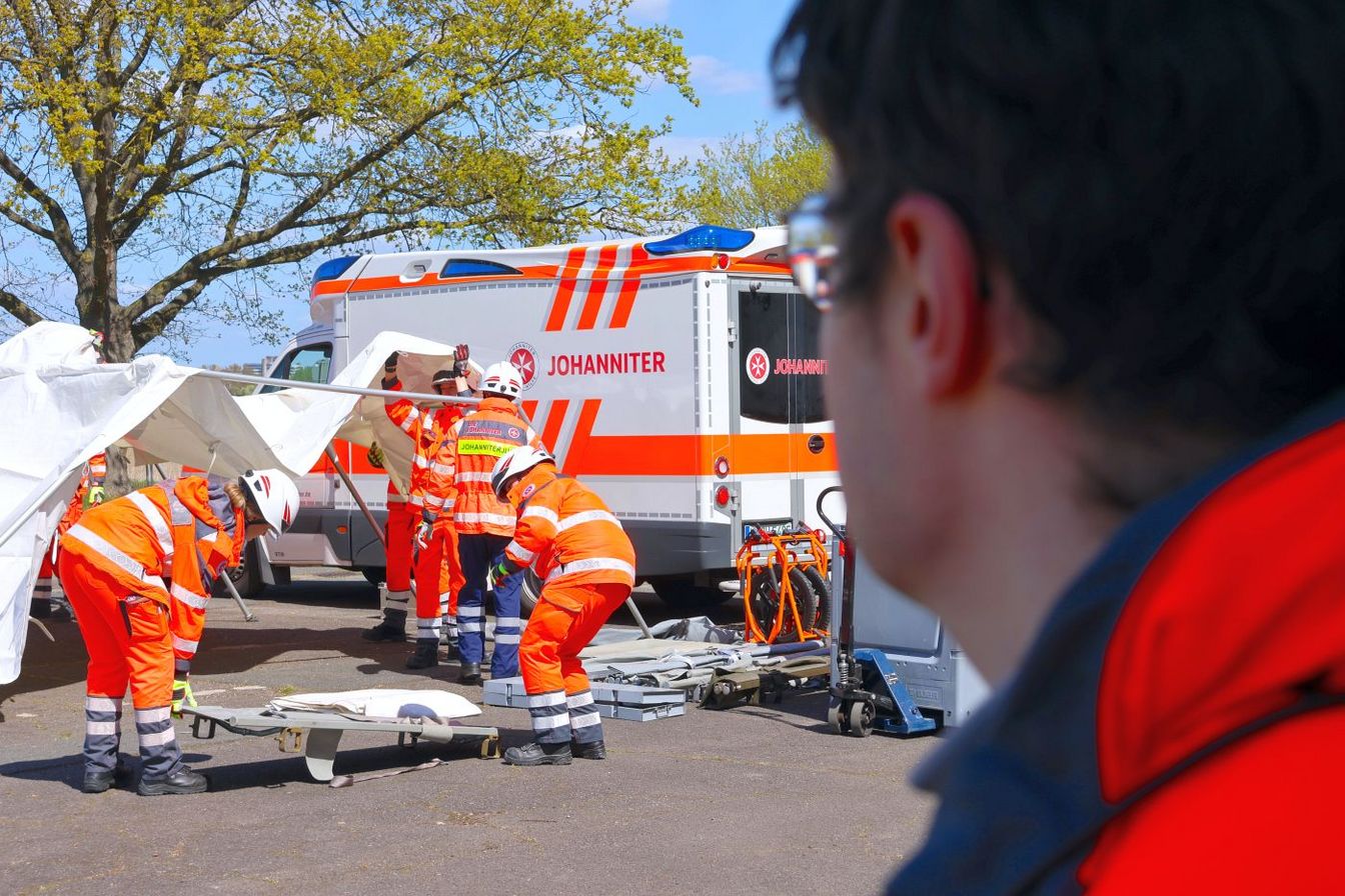 Die Johanniter sind nicht nur in der Grundschule unterwegs. Bei der Freiwilligen Feuerwehr Lemmie in Gehrden trainieren sie die Reanimation; in der eigenen Dienststelle am Hagacker geht es um die Behandlung von Arbeitsunfällen. Am Nachmittag aber finden sich das Organisationsteam samt allen Helfenden und RUD-Darstellern gemeinsam auf dem Gelände der Feuerwehrtechnischen Zentrale (FTZ) in Ronnenberg ein. Dort bauen die Helfenden eine Unfallhilfsstelle mit Zelt und Patientenablage auf. Mit dabei sind erfahrene Einsatzkräfte, aber auch Anfänger wie Tim Ullrich. Der 16-Jährige geht in Wennigsen zur Schule und ist Mitglied der Johanniter-Jugend. An der Übung nimmt er unter Begleitung von Erwachsenen und Jugendteamern teil; bei keinem Schritt ist er allein. In diesem geschützten Rahmen darf auch er Verbände anlegen und beim Zeltaufbau helfen. „Nach der Schule möchte ich gern Notfallsanitäter werden“, sagt Tim. Bei den Johannitern könne er jetzt schon viel lernen. Der gesamte Ortsverband Deister sammelt an diesem Tag praktische Erfahrung. „Solche Übungen bereiten uns als Gemeinschaft gut auf unsere Einsätze vor“, sagt Notfallsanitäter Niklas Tracht, der zum Leitungsteam der Ronnenberger Ehrenamtlichen gehört.