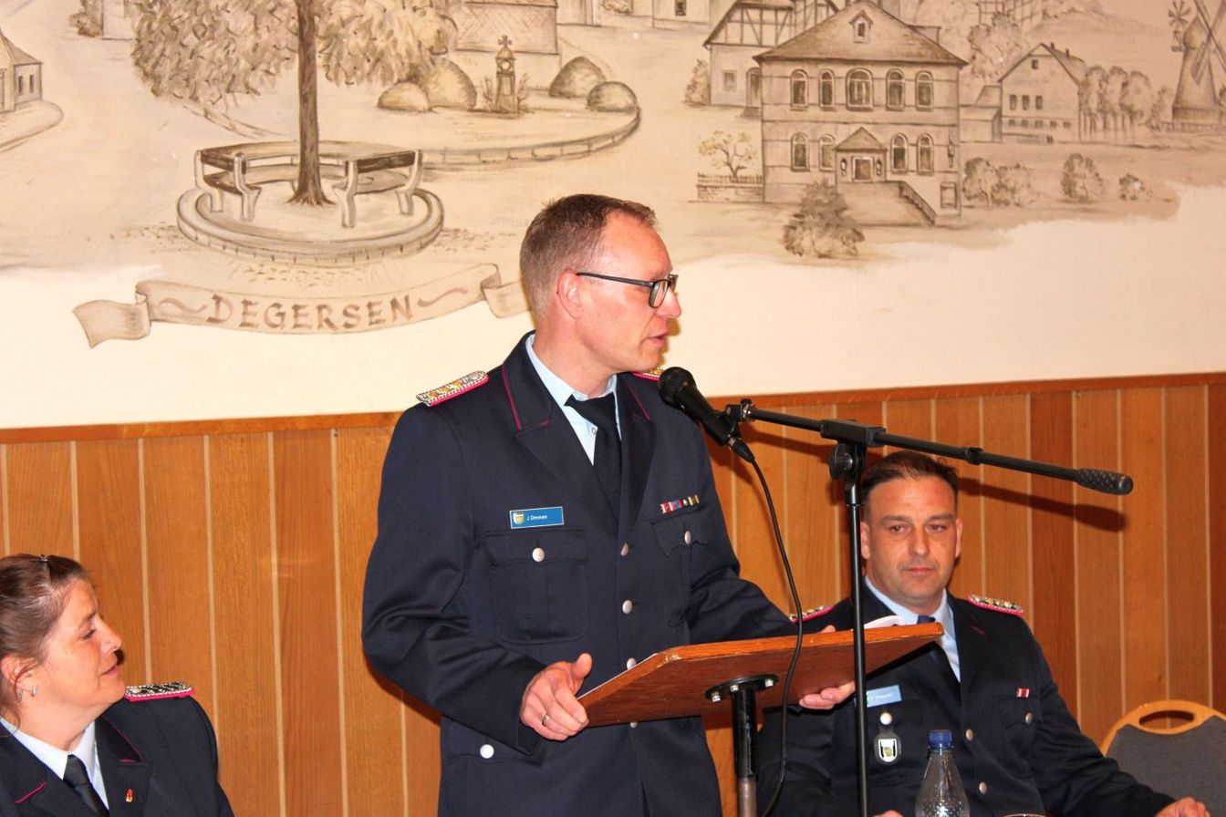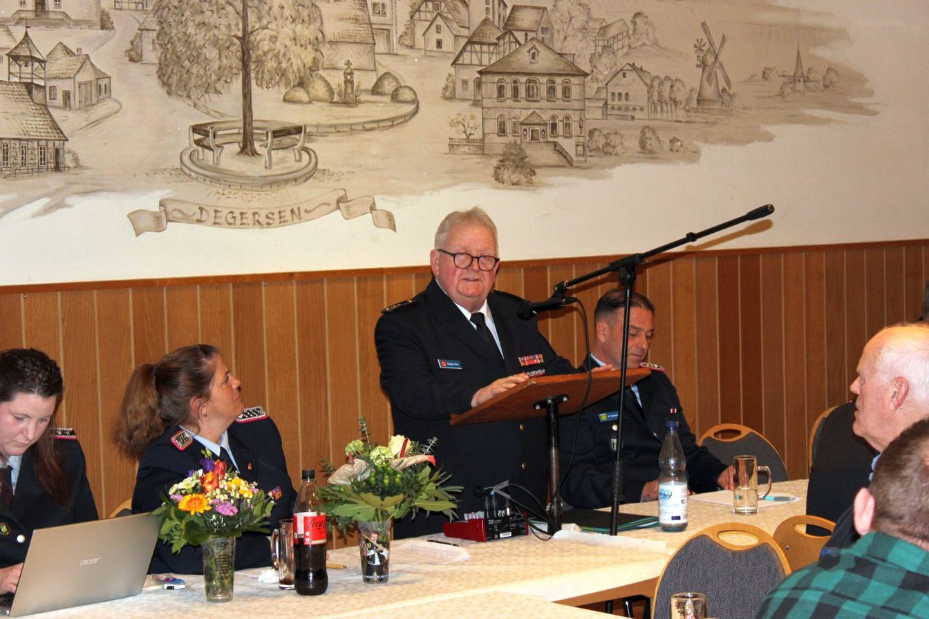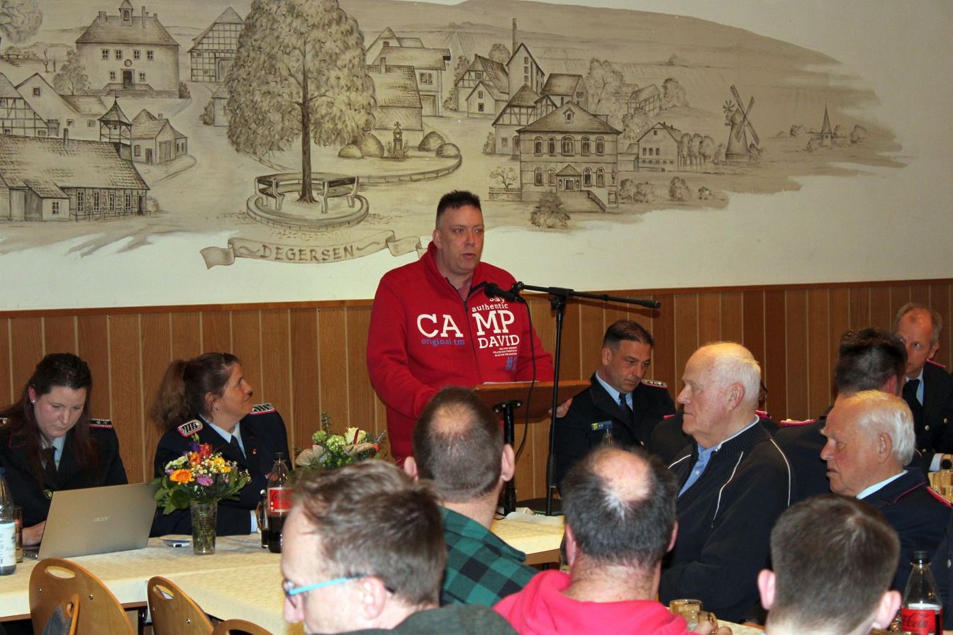 „Ich bin guter Hoffnung, dass dies die letzte Versammlung sein wird, bevor der Einzug ins neue Feuerwehrhaus erfolgt.“ Der Bau soll im Sommer fertig werden. Verzögerungen seien bislang immer wieder aufgeholt worden. „Manche Bürger fragen sich jedoch, warum bekommt die Feuerwehr Degersen für 5 Millionen so ein großes Feuerwehrhaus“, erklärte der Bürgermeister: „Nun, die Ansprüche wachsen. Zwei Stellplätze sind für die Ortsfeuerwehr und zwei Stellplätze für Fahrzeuge der Gemeindefeuerwehr. Wir erfüllen damit das, was von der Feuerwehrunfallkasse vorgegeben wird.“