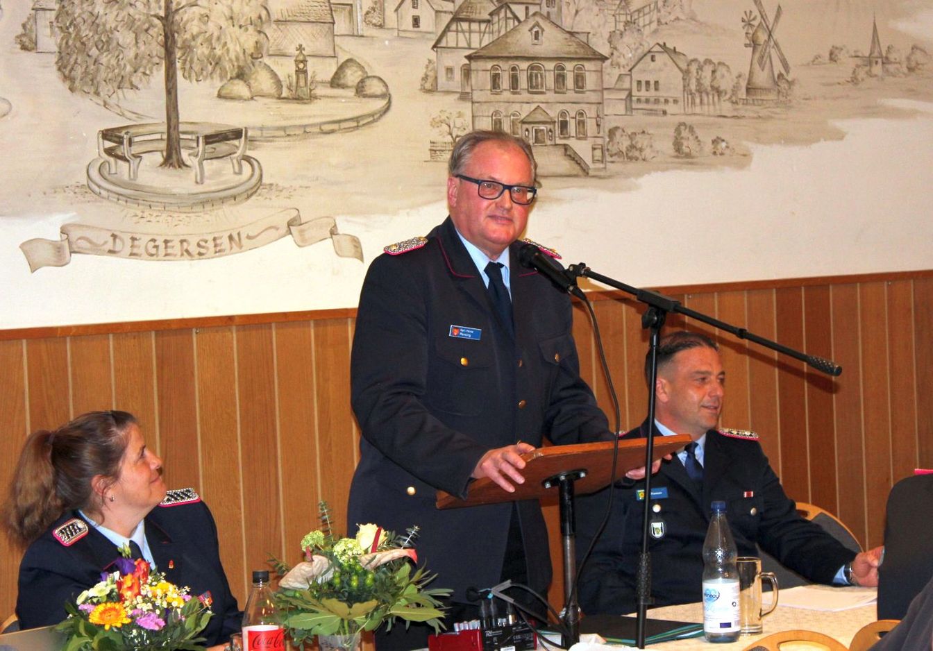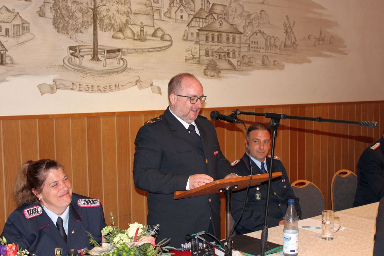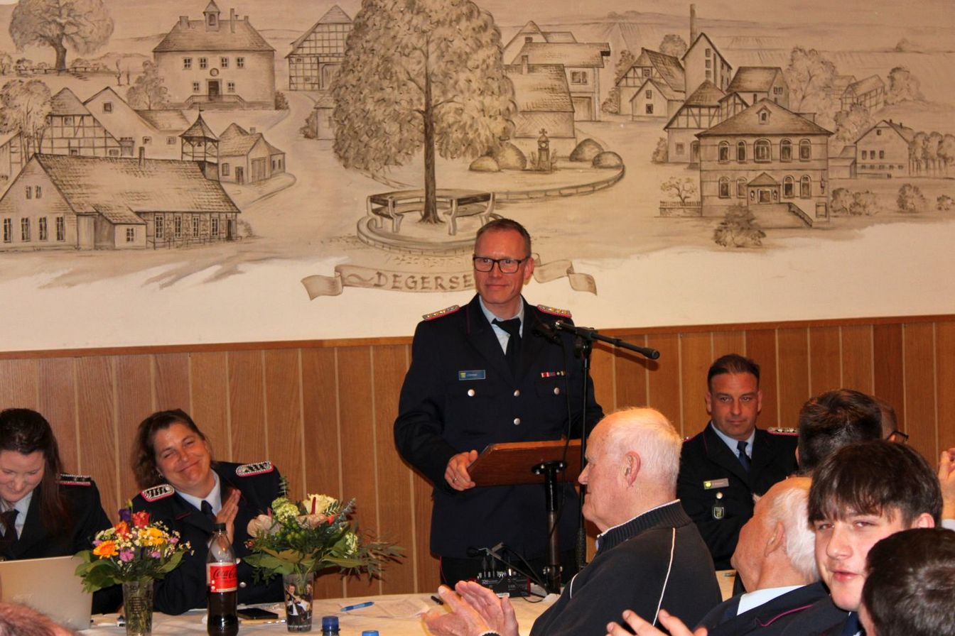 „Ich bin guter Hoffnung, dass dies die letzte Versammlung sein wird, bevor der Einzug ins neue Feuerwehrhaus erfolgt.“ Der Bau soll im Sommer fertig werden. Verzögerungen seien bislang immer wieder aufgeholt worden. „Manche Bürger fragen sich jedoch, warum bekommt die Feuerwehr Degersen für 5 Millionen so ein großes Feuerwehrhaus“, erklärte der Bürgermeister: „Nun, die Ansprüche wachsen. Zwei Stellplätze sind für die Ortsfeuerwehr und zwei Stellplätze für Fahrzeuge der Gemeindefeuerwehr. Wir erfüllen damit das, was von der Feuerwehrunfallkasse vorgegeben wird.“