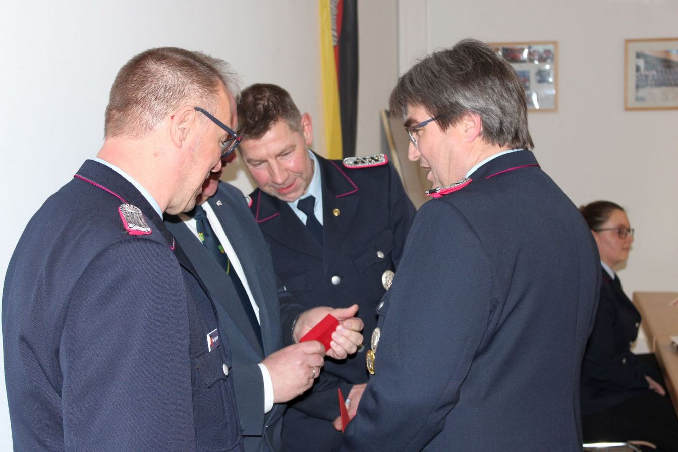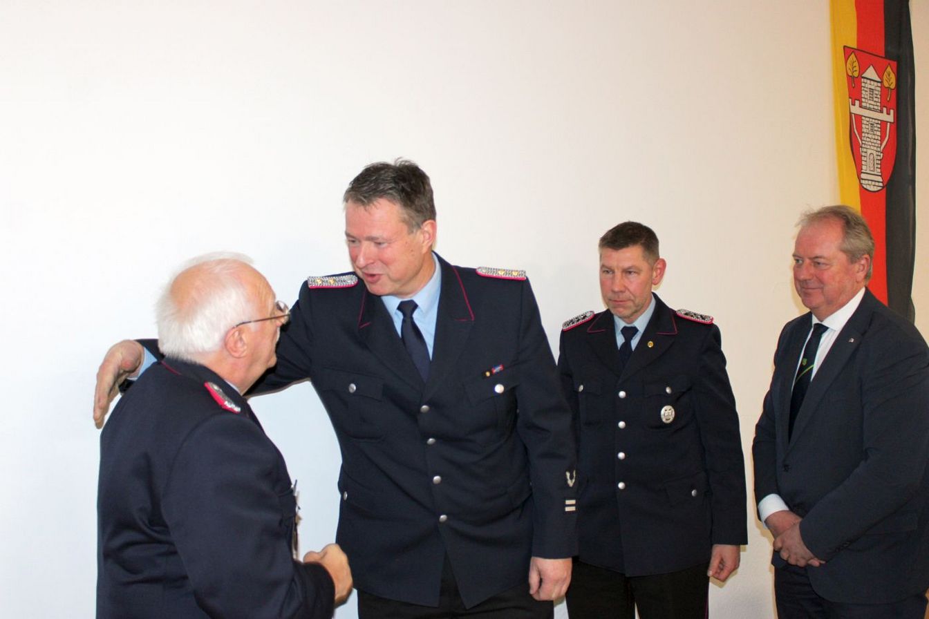 Da es in der diesjährigen Versammlung keine Beförderungen gab, leitete Engelmann direkt zum Tagesordnungspunkt Ehrungen über. Cord Hennies wurde für 40 Jahre Mitgliedschaft in der Feuerwehr geehrt. Zudem wurde Ehrenbrandmeister Jürgen Zingler (70) nach einstimmiger Zustimmung der Kameraden zum Ehrenmitglied ernannt.