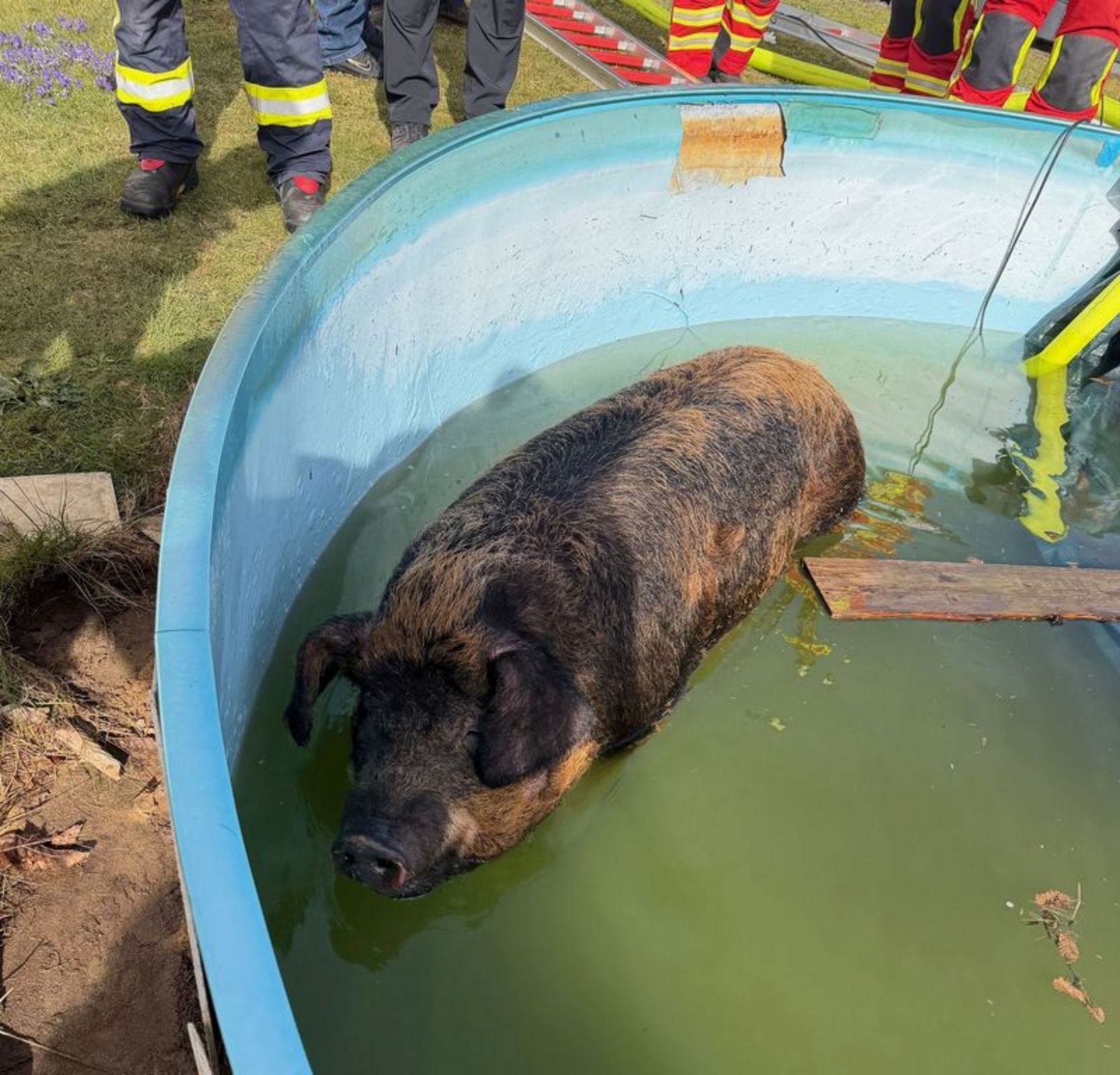 Garbsen. Ein ungewöhnlicher Einsatz beschäftigte am Sonntag, 12. April,  die Feuerwehr in Frielingen: Ein rund 300 Kilogramm schweres Schwein musste aus einem Gartenpool befreit werden. Das Tier war aus bislang ungeklärter Ursache in das Becken geraten und konnte sich aus eigener Kraft nicht mehr befreien.