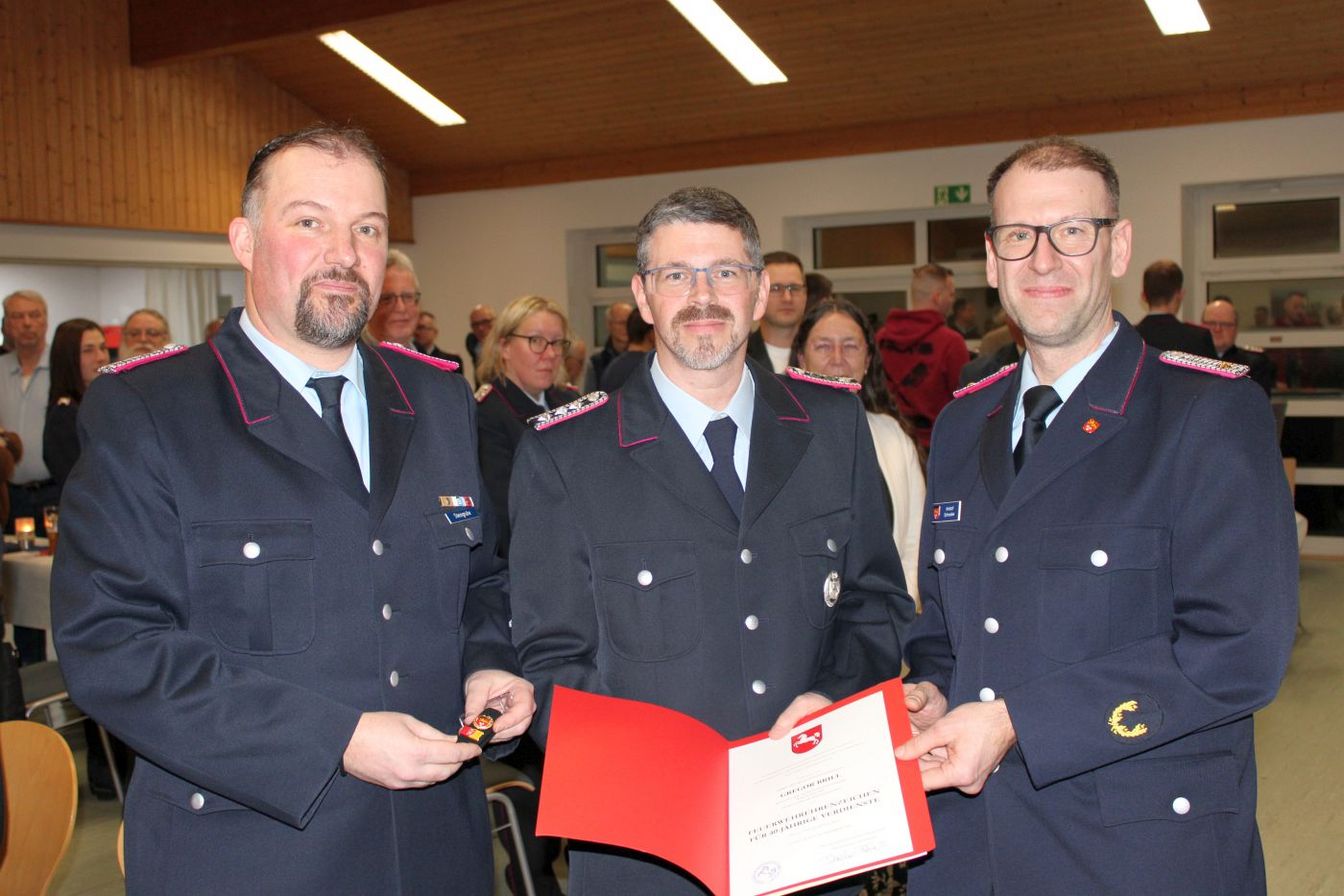 Ortsbrandmeister Steingrube (l.) und Brandschutzabschnittsleiter II Schwake (r.) ehren Andreas Goltermann für 40 Jahre aktive Mitgliedschaft.