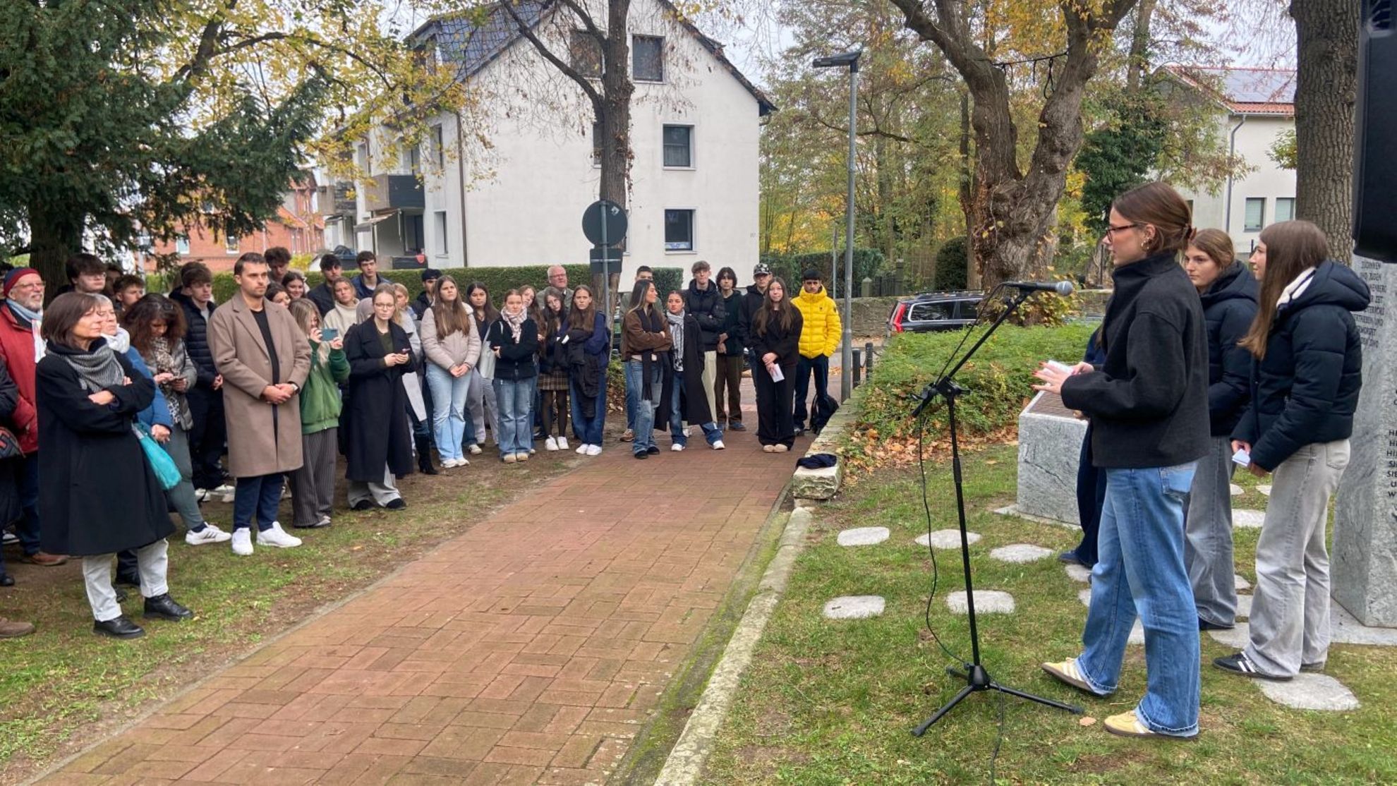 Nach den Ansprachen von Bürgermeister Marlo Kratzke und Schulleiter Kay Warneke legten die Teilnehmenden am Mahnmal ein Blumengebinde nieder. Anschließend ging es gemeinsam zum nahegelegenen jüdischen Friedhof, der sich schnell füllte. Viele Besucherinnen und Besucher verfolgten die Veranstaltung von außerhalb der Friedhofsmauer.