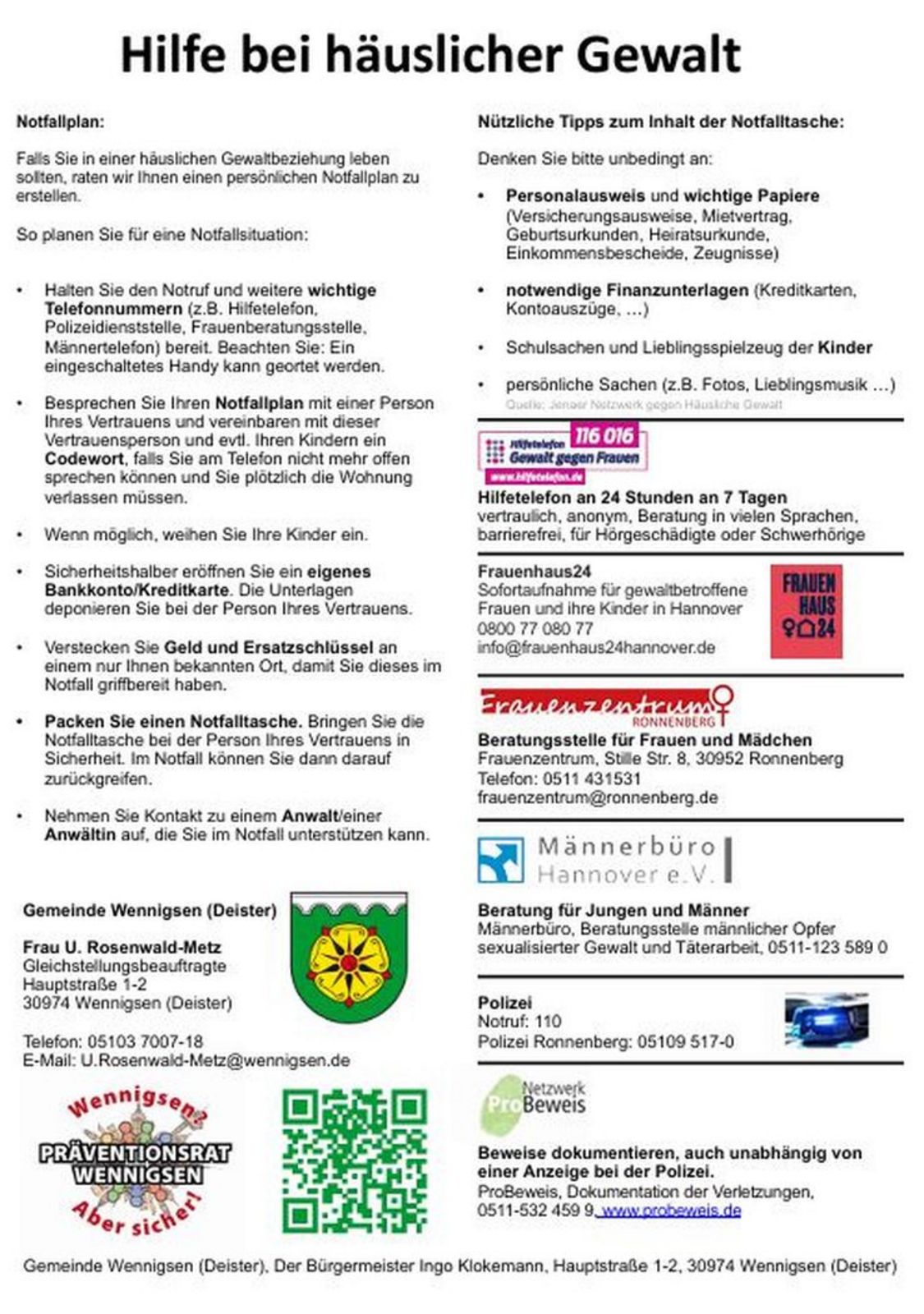Der Aushang informiert außerdem über regionale und bundesweite Hilfsangebote wie das Hilfetelefon „Gewalt gegen Frauen“, das Frauenhaus24 in Hannover, das Frauenzentrum Ronnenberg und das Männerbüro Hannover. Das Netzwerk „ProBeweis“ bietet darüber hinaus die Möglichkeit, Verletzungen vertraulich dokumentieren zu lassen, ohne direkt eine Anzeige erstatten zu müssen.