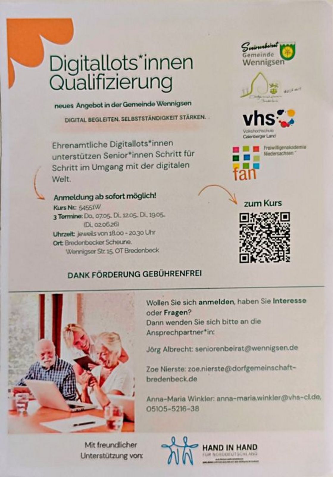 Ziel der Qualifizierung ist es, Digitallotsinnen und Digitallotsen auf ihren Einsatz in Mediencafés, Sprechstunden oder Einzelberatungen vorzubereiten und ältere Menschen – oder allgemein Personen, die Unterstützung benötigen – auf Augenhöhe digital zu begleiten. Das Projekt ist eine Kooperation der Volkshochschule Calenberger Land, des Seniorenbeirats Wennigsen, der Freiwilligenakademie Niedersachsen sowie des Quartiersmanagements Bredenbeck.
