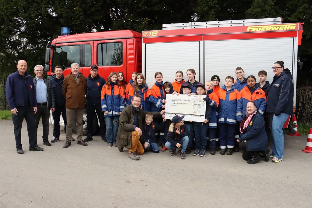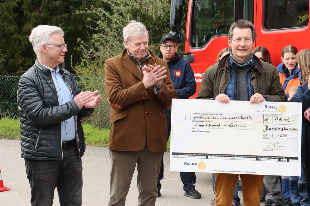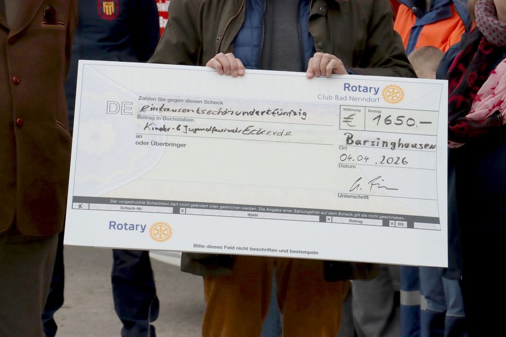 Das Geld stammt aus einer Sammlung, die Eberhard von Ilten- Ausmeyer anlässlich seines 70sten Geburtstags im Februar 2026 initiiert hatte. Als ehemaliges Gründungsmitglied der Jugendfeuerwehr Eckerde bat er statt Geschenken um Spenden an den Gemeindienst des Rotary Club Bad Nenndorf, dessen Mitglied er ist. Der Rotary Club Bad Nenndorf, dessen Einzugsgebiet sich von Stadthagen über das Calenberger Land bis an den Rand der Landeshauptstadt erstreckt, fördert insbesondere Jugendarbeit, Soziales, Völkeraustausch und Bildung. Seine Mitglieder haben häufig Erfolg im Leben und möchte der Gesellschaft mit ihrem Engagement etwas zurückgeben. In diesem Fall lag es nah, die Spende für Kinder und Jugendliche im Geburtsort von Eberhard von Ilten- Ausmeyer zu verwenden. Und so überreichten Karsten Fischer, Vorsitzender des Gemeindienstes und Torsten Bethke, Präsident des Rotary Club Bad Nenndorf gemeinsam mit Eberhard von Ilten-Ausmeyer den symbolischen Scheck im Beisein vieler Kinder am Abend des Osterfeuers. Mariela Chiarelli möchte davon mit den 18 Kindern der Kinderfeuerwehr einen Tagesausflug in den Zoo Hannover unternehmen, was aus dem normalen Budget nur schwer zu finanzieren wäre. Jugendwart Matthias Zimmermann, der aktuell 30 Kinder betreut, wird das jährliche Zeltlager gemeinsam mit der Jugend des ASB ausrichten und eventuell fehlende Kleidung für die Jugendfeuerwehr ergänzen, da die Kinder im Alter von 10-16 Jahren oft viel zu schnell aus ihrer Dienstkleidung herauswachsen.