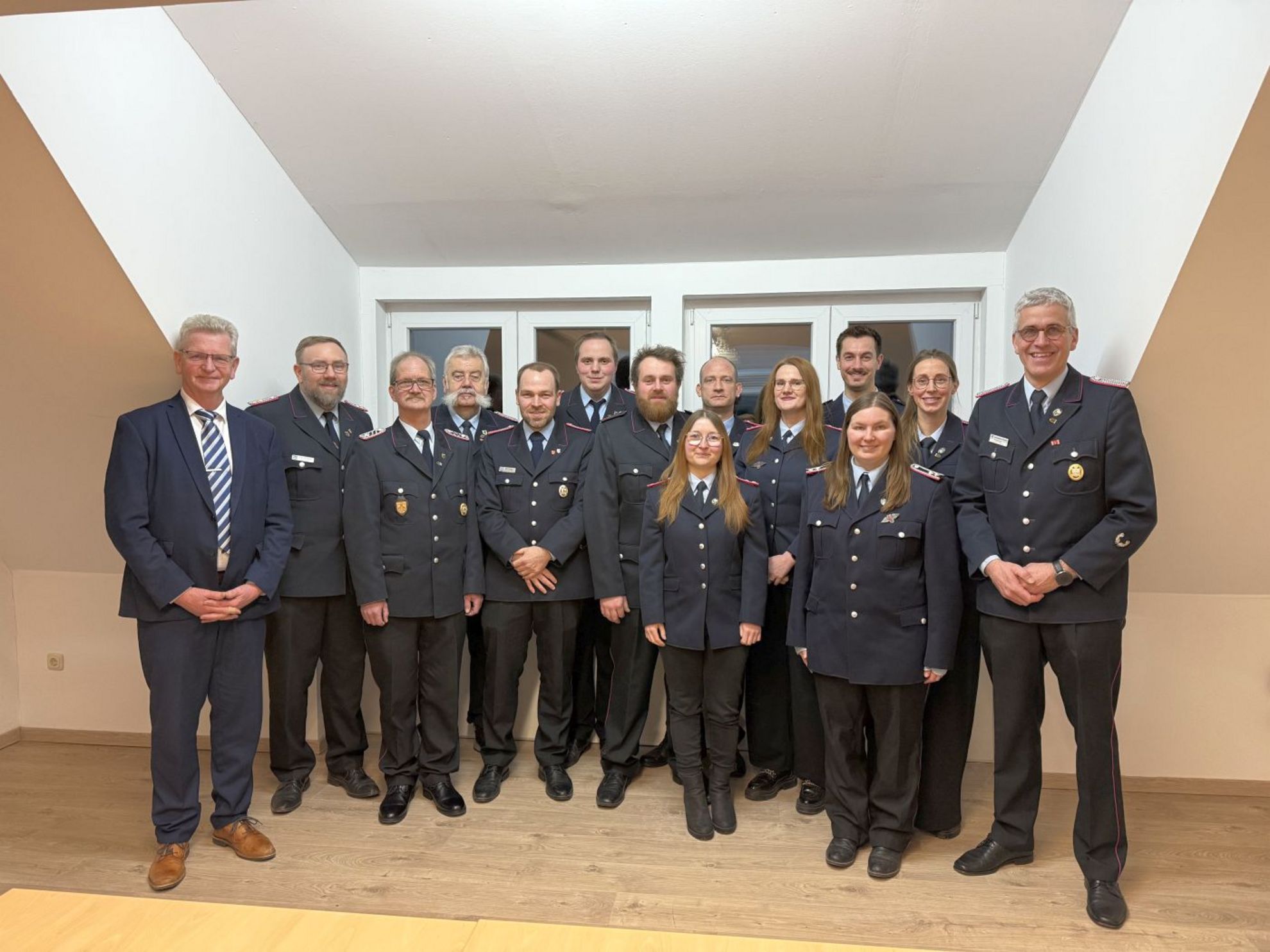 v.l. Vertreter der Stadtverwaltung Clemens Gebauer, stellv. Stadtbrandmeister Tobias Metz, Martin Hetter, Brandschutzabschnittsleiter 3 a.D. Rudi Bennecke, Nils Rusek, Paul Henkels, Florian Koch, Lars Büttner, Sophie-Louise Tscharntke, Katharina Hubert, Andreas Commichau, Annika Hartmann, Anke Scholz, Ortsbrandmeister Torsten Tidow. Foto: Eric Bauer.