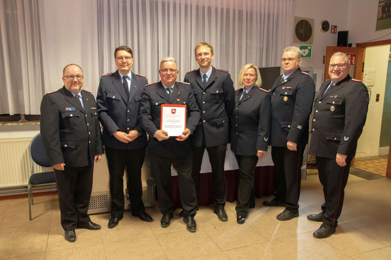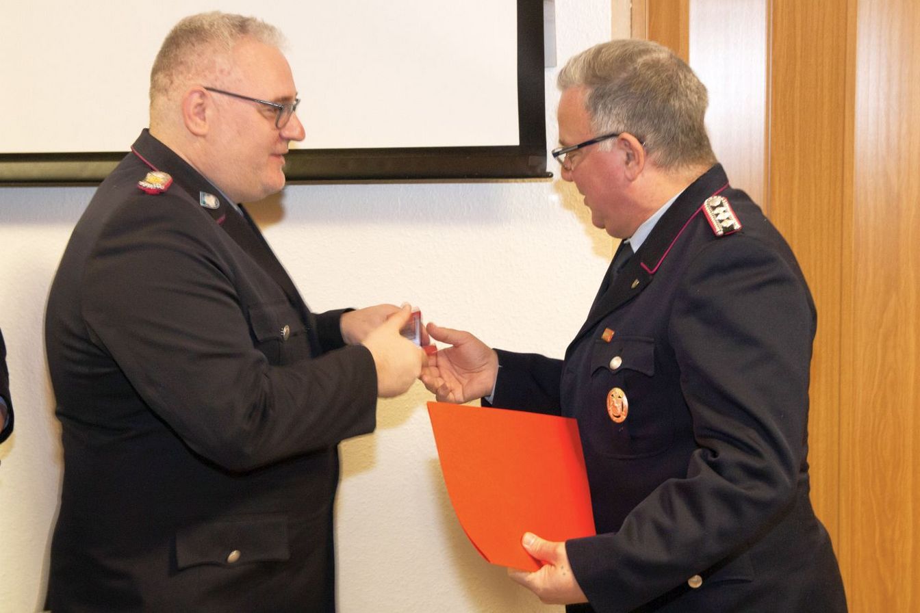 Der Stellv. Abschnittsleiter II Helge Jakob ehrte den Ersten Hauptfeuerwehrmann Constantinos Solakis für 25 Jahre aktive Mitgliedschaft in der Feuerwehr Vörie und verlieh ihm das dazugehörige Abzeichen des Landesfeuerwehrverbandes Niedersachsen.