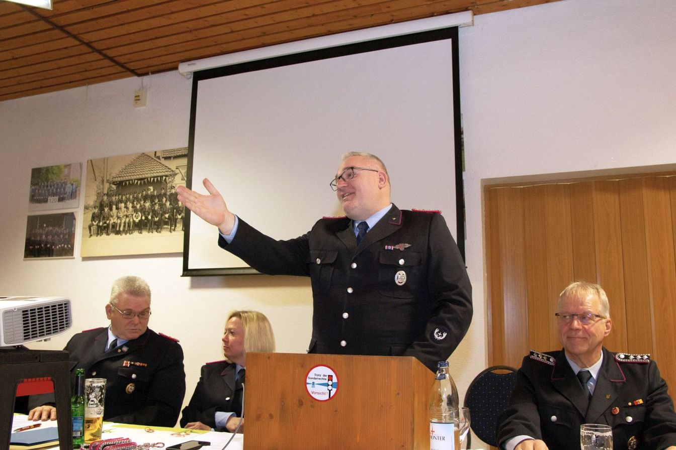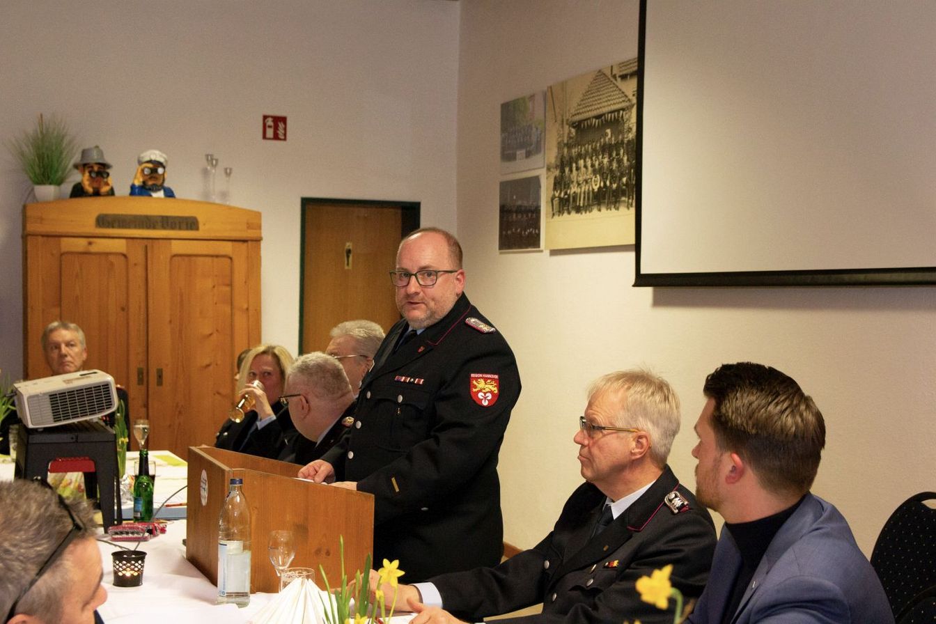 Es folgten die Grußworte der Gäste, insbesondere durch den Bürgermeister der Stadt Ronnenberg, Marlo Kratze. Es gab einen Überblick über die anstehenden Baumaßnahmen der Freiwilligen Feuerwehren in der gesamten Stadt Ronnenberg und ging vorrangig auf den anstehenden Neubau des gemeinsamen Feuerwehrgerätehauses der Ortsfeuerwehren Vörie und Linderte ein. Marlo Kratzke verdeutlichte in seiner Rede, dass der Neubau zwischen den Orten Linderte und Vörie als klares Bekenntnis der Stadt Ronnenberg zum Erhalt der Freiwilligen Feuerwehren Vörie und Linderte verstanden werden kann.