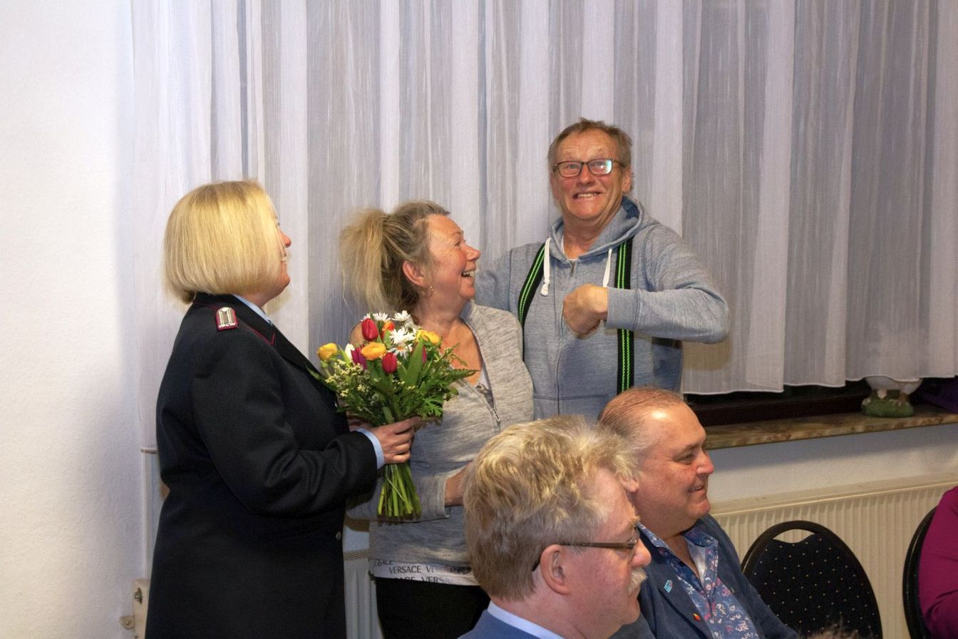 Ortsbrandmeisterin Ines Dankenbrink überreichte ihrem Vorgänger Hartmut Wissel ein Präsent, da dieser im Jahr 2025 die höchste Dienstbeteiligung vorweisen konnte.