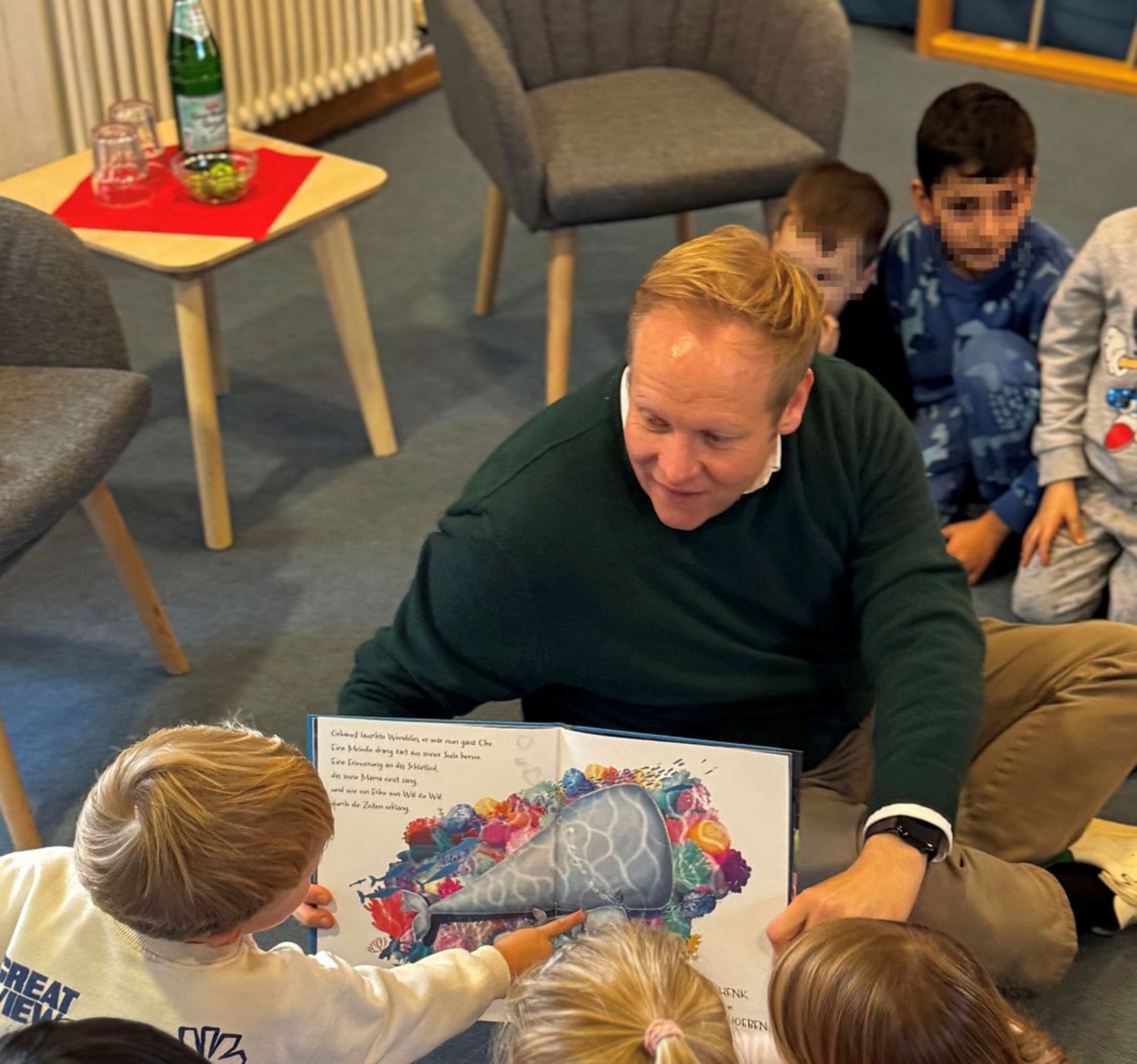 Kuban las aus dem Bilderbuch „Der Wal, der immer mehr wollte“ von Rachel Bright. Die Geschichte von Wendelin, einem Wal, der erst durch Teilen statt Sammeln glücklich wird, zog die Kinder schnell in ihren Bann. Vor allem die bunten Bilder sorgten für große Augen und viele Nachfragen.
