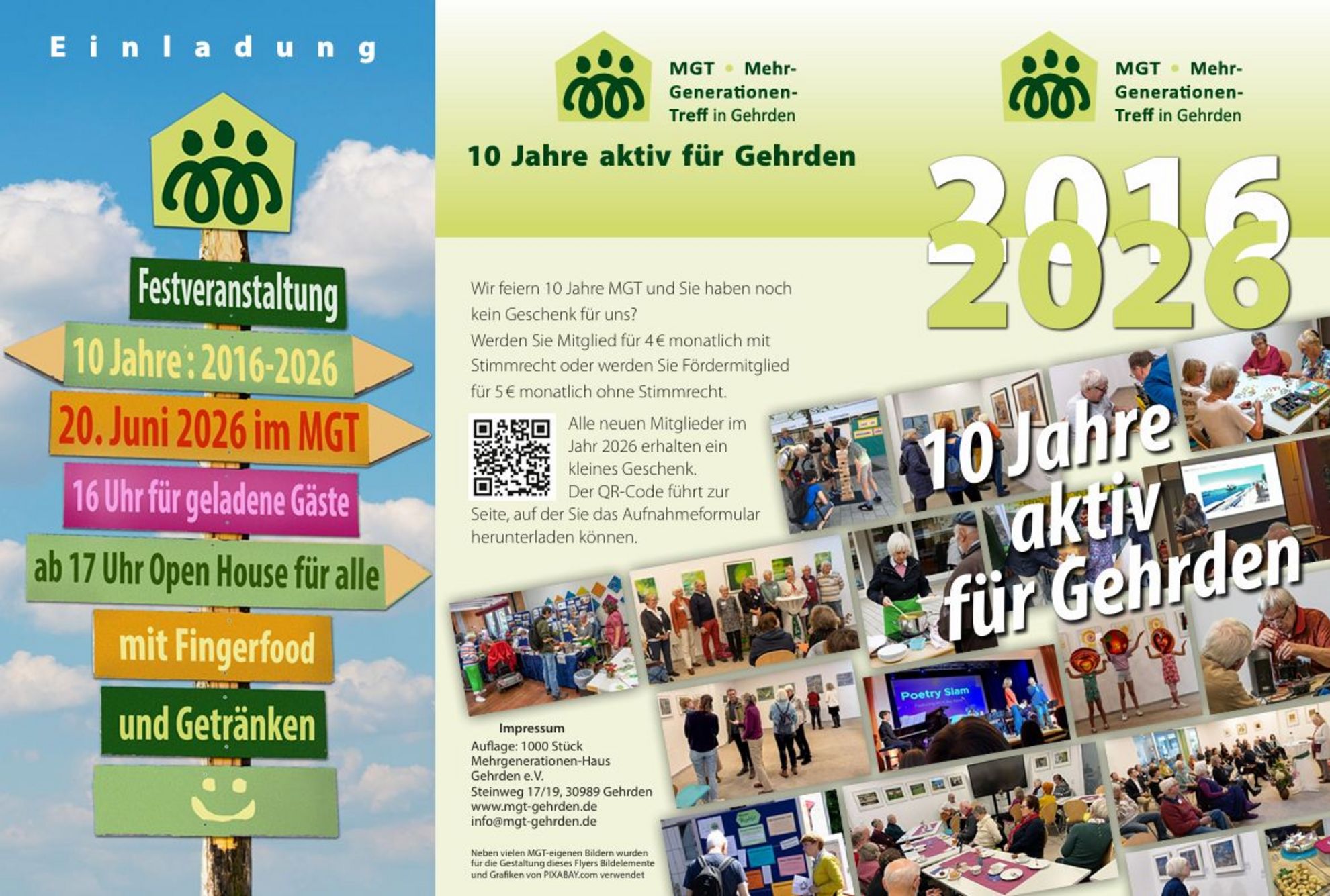 Der Jubiläumsflyer ist im MGT-Treff, an vielen Stellen im Stadtgebiet – unter anderem im Hallenbad, im Rathaus und in verschiedenen Geschäften – sowie online auf der Website des Vereins erhältlich, oder in der Bildergalerie dieses Artikels zu sehen. Höhepunkte des Jubiläumsjahres sind eine große Festveranstaltung am 20. Juni sowie eine Generationenparty am 10. Oktober im Jupa. Weitere Informationen zu beiden Veranstaltungen sollen rechtzeitig bekannt gegeben werden.
