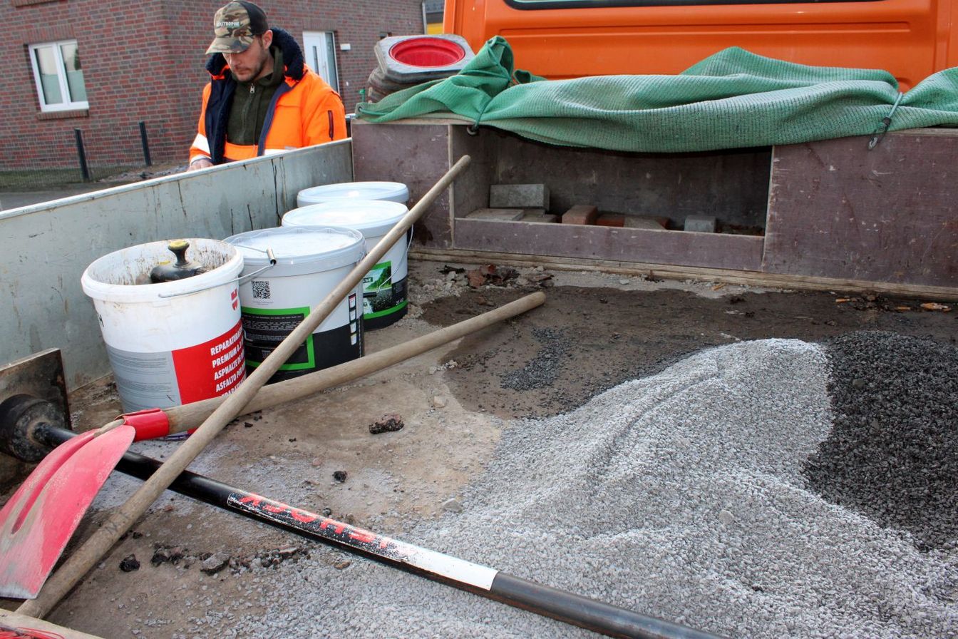 „Im Schnitt bringen wir pro Tag bis zu sechs Tonnen Asphalt auf“, erklärt Tobias Hielscher (37), Leiter des Baubetriebshofs. „Jetzt, direkt nach dem Schnee, können wir mit dem Kaltasphalt nur kleinere Flickarbeiten ausführen.“