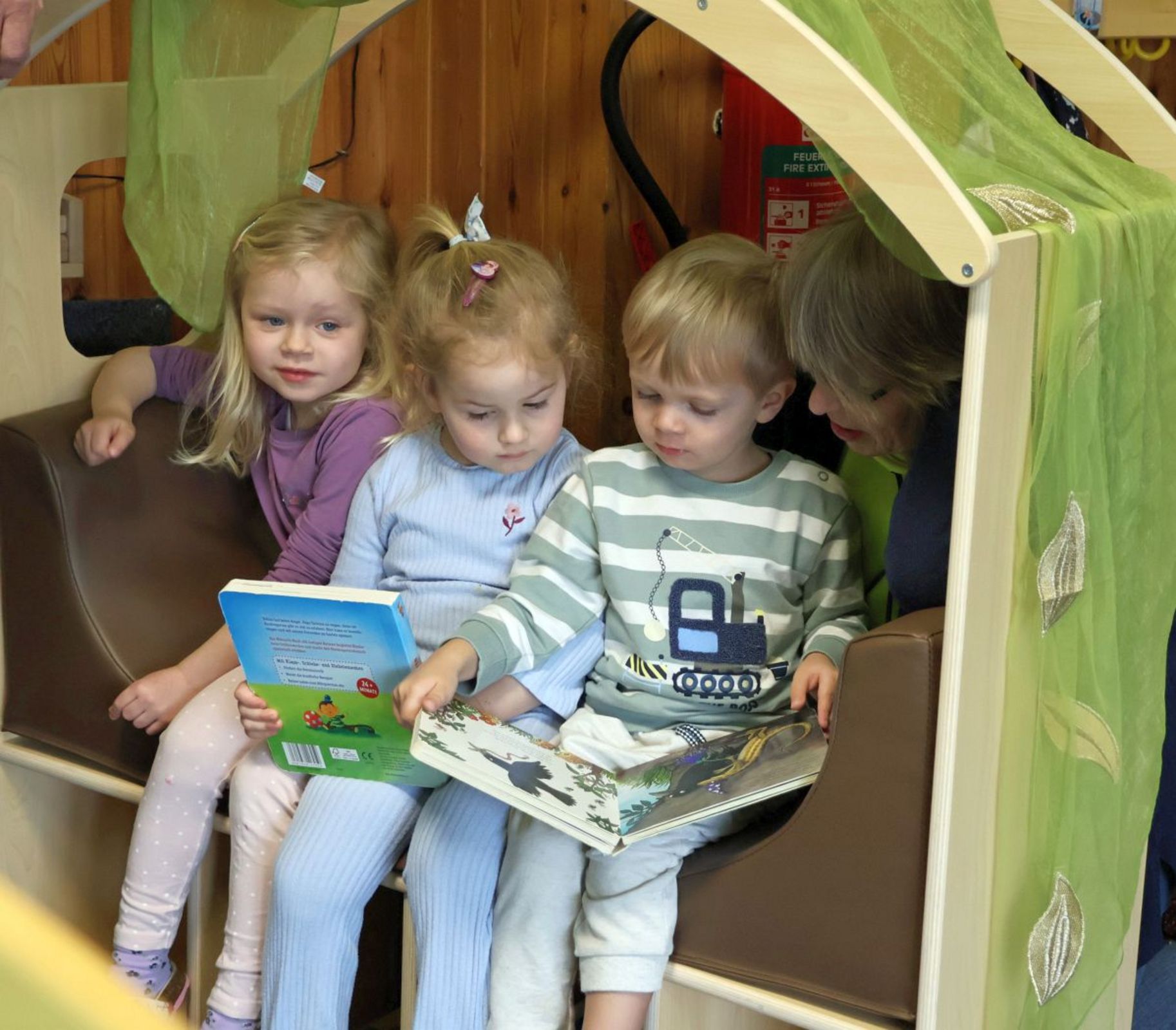 Unter den Sitzflächen befinden sich kleine Fächer mit Büchern, die jederzeit griffbereit sind. Das Angebot wird regelmäßig angepasst und orientiert sich an den Jahreszeiten oder aktuellen Themen im Kita-Alltag.