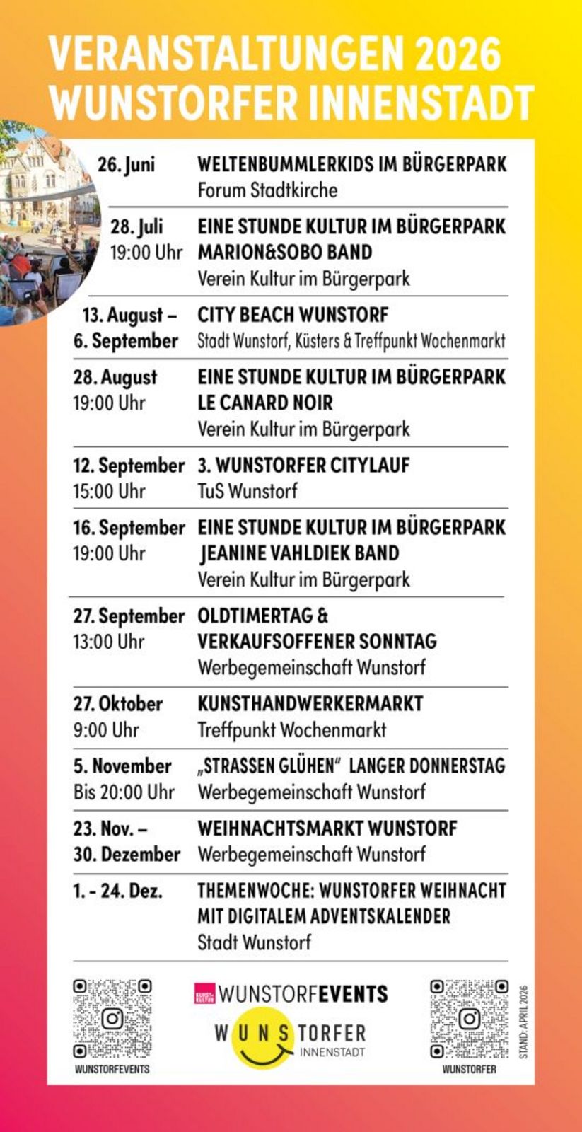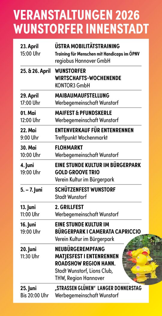Der Flyer enthält alle Veranstaltungen, die direkt in der Wunstorfer Innenstadt stattfinden – Veranstalter sind dabei die Werbegemeinschaft Wunstorf e.V., die Deutsche Marktgilde, Getränke Heidorn, Kontor3, der Verein Kultur im Bürgerpark, der Verein FORUM Stadtkirche, der TuS Wunstorf, die Stadt Wunstorf selbst und viele weitere.