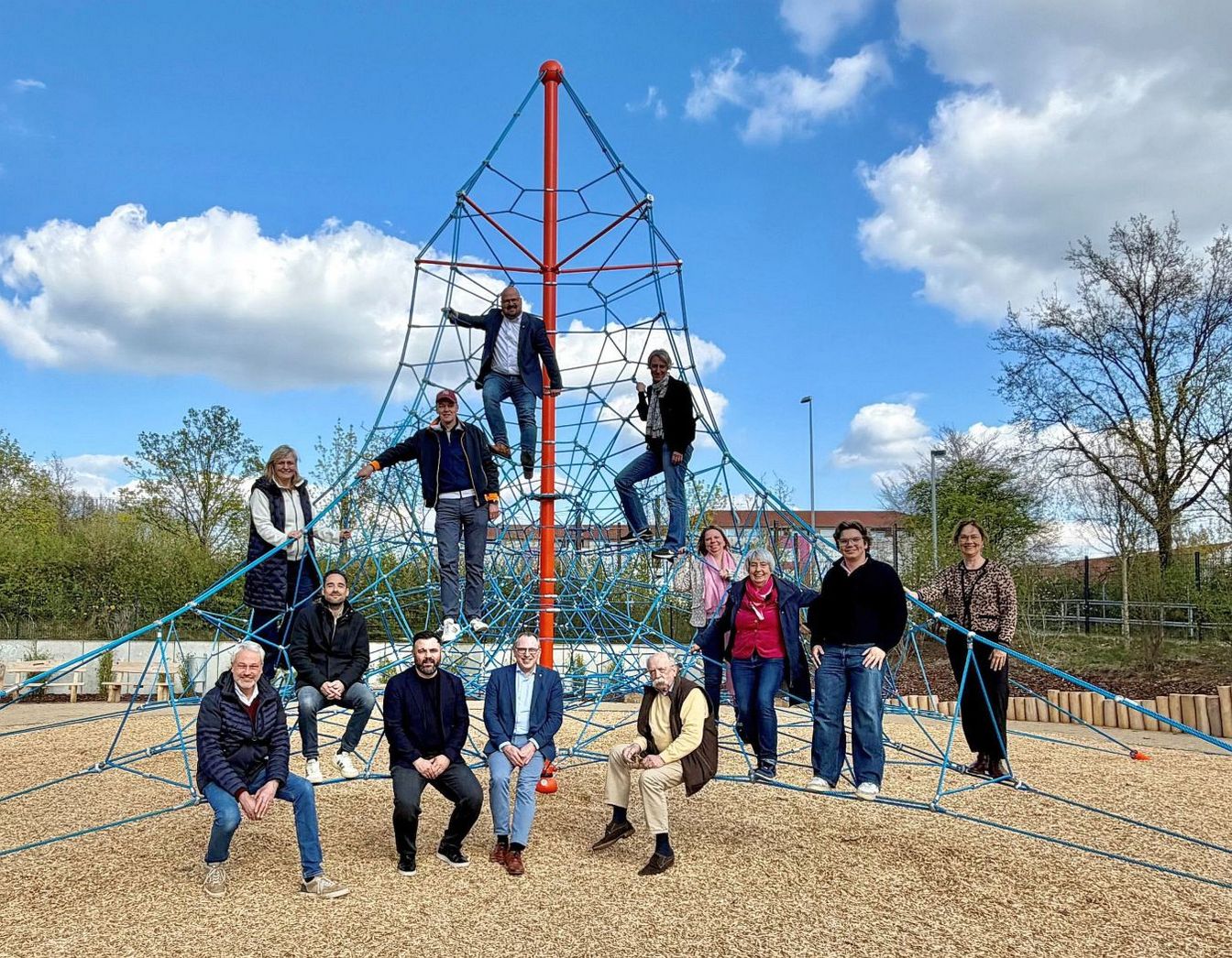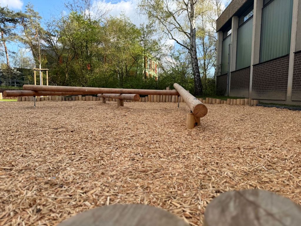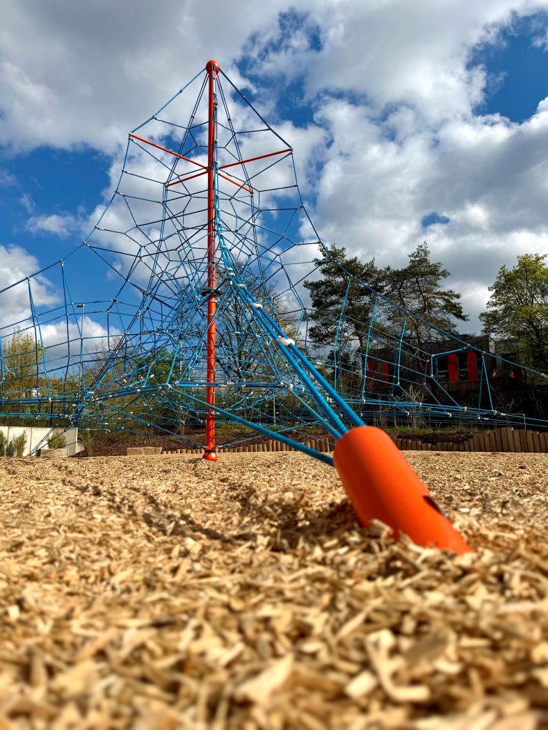 Herzstück ist eine rund 7,2 Meter hohe Seilpyramide in Orange und Blau. Ergänzt wird sie durch eine Mikado-Wippe und einen Balancierbalken, die zum Ausprobieren und Austoben einladen. Auch für ruhigere Momente ist gesorgt: Holzbänke, Baumstämme und Natursteine bieten Platz zum Sitzen und Treffen. Zwei junge Hainbuchen und zahlreiche Haselnuss-Sträucher begrünen das neu gestaltete Gelände. Niedrige Umrandungen aus senkrecht gesetzten Holzstämmen fassen die unterschiedlichen Spielbereiche der Anlage ein.