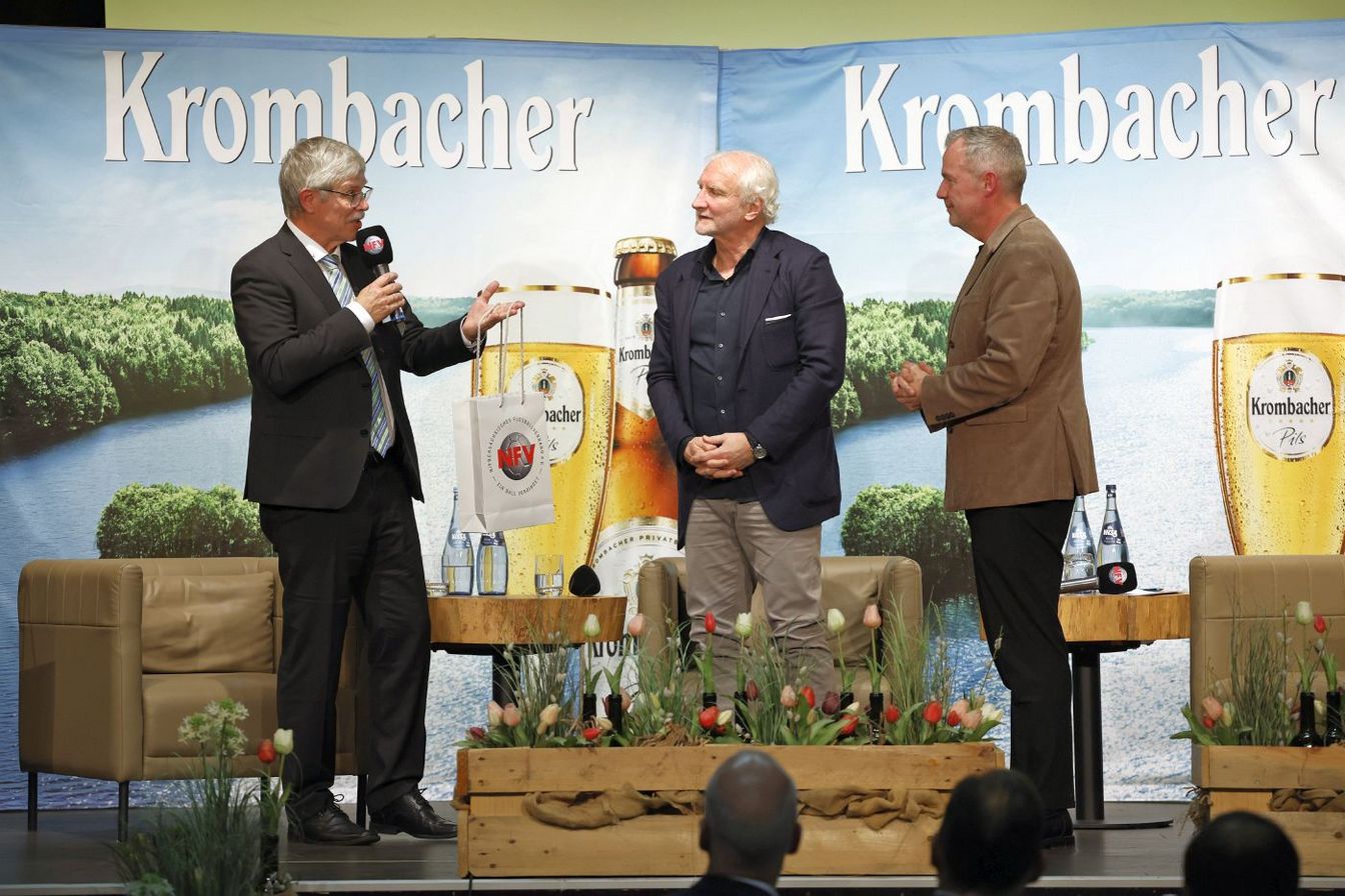 Sie alle verfolgten gespannt den Ausführungen des DFB-Sportdirektors und ehemaligen Weltmeisters Rudi Völler, der gemeinsam mit NFV-Präsident Ralph-Uwe Schaffert und Moderator Andreas Wurm bei einer launigen Podiumsdiskussion unter anderem über seine Anfänge als Teamchef der deutschen Mannschaft sprach. Sein erstes Spiel als Trainer der deutschen Nationalmannschaft bestritt der gebürtige Hanauer im Jahr 2000 ausgerechnet in Hannover. Der 4:1-Sieg gegen Spanien war der Startschuss für einen erfolgreichen Auftakt zur WM-Qualifikation 2002 in Japan und Südkorea, wo die deutsche Mannschaft unter Völler – für viele überraschend – Vize-Weltmeister wurde. Rund um seine Premiere als Trainer bereitete sich das Team in Barsinghausen auf das Spiel gegen die spanische Mannschaft um Raúl und Pep Guardiola vor. „Pep habe ich in der Vergangenheit immer mal wieder getroffen, da haben wir auch über das Spiel in Hannover gesprochen. Daran konnte er sich noch gut erinnern“, berichtete Völler schmunzelnd.