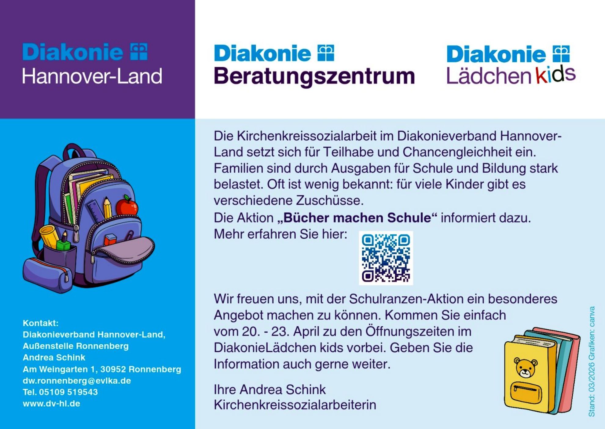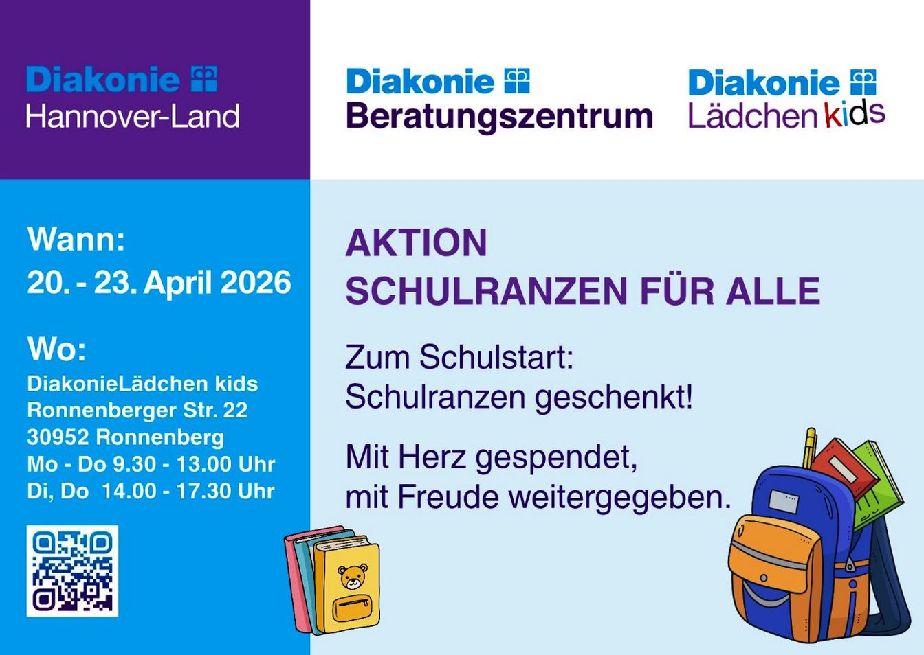 Die Ausgabe der Schulranzen findet vom 20. bis 23. April 2026 im DiakonieLädchen kids in Ronnenberg statt. Während der Öffnungszeiten können Familien vorbeikommen und sich über das Angebot informieren sowie Schulranzen erhalten.
