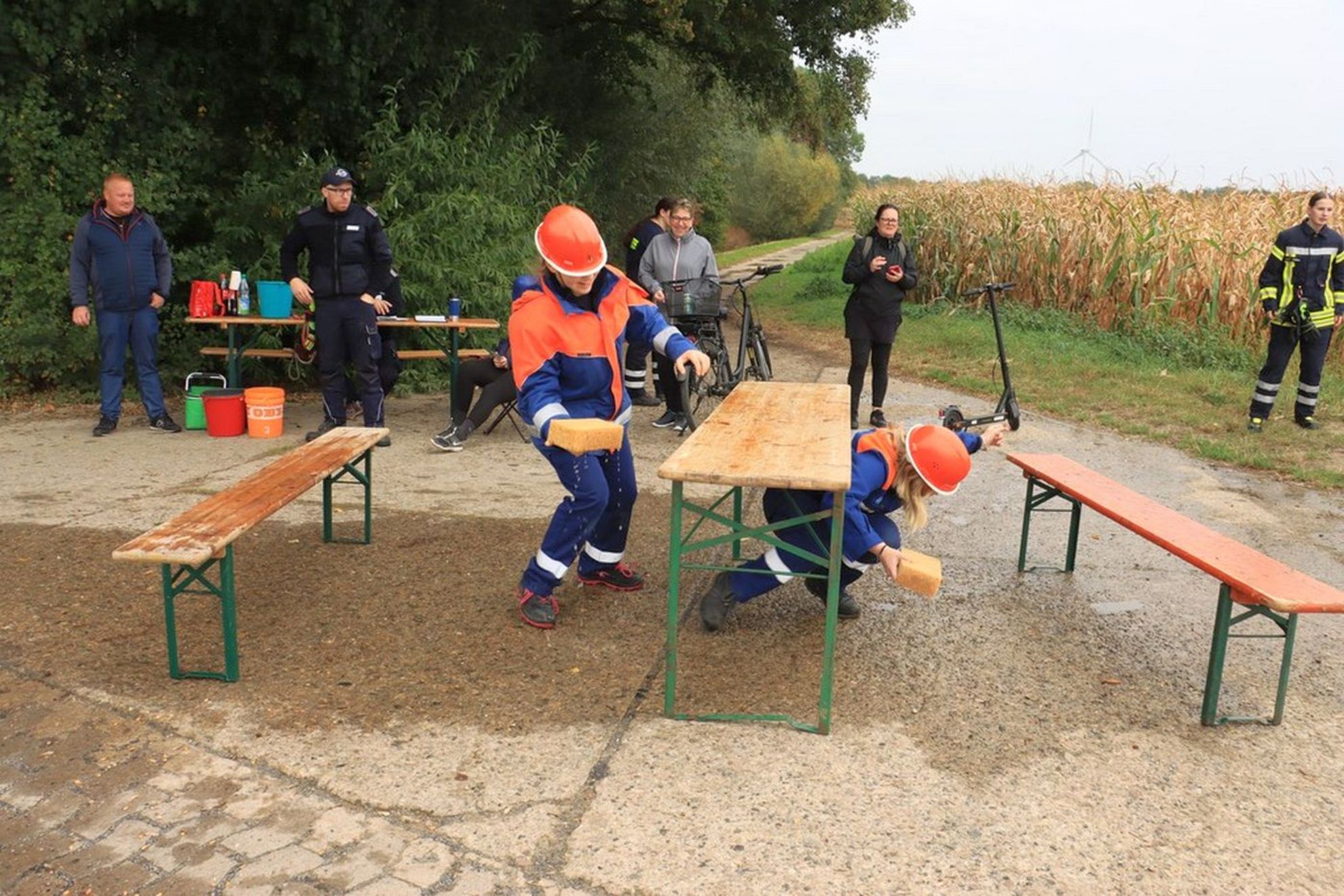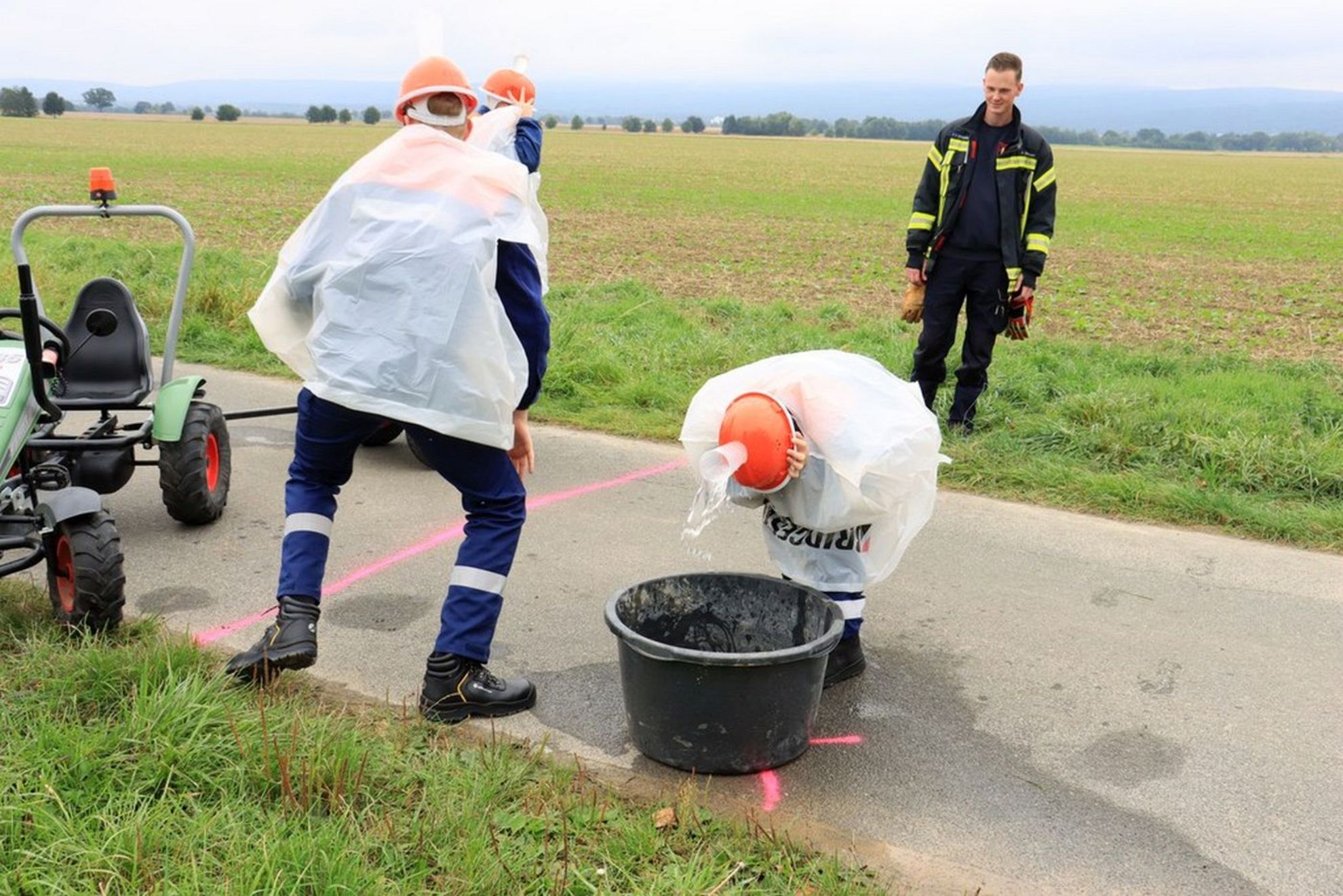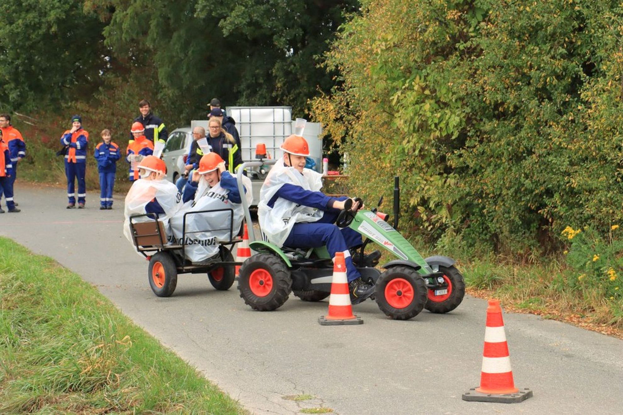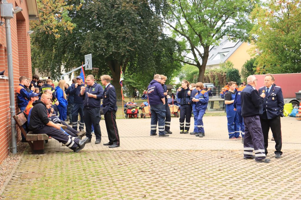 An 10 Spielstationen mussten fast 200 Kinder und Jugendliche aus 12 Ortswehren Geschicklichkeit und Können unter Beweis stellen, um möglichst viele Wertungspunkte zu erreichen. Es galt zum Beispiel aus so vielen Feuerwehrgerätschaften wie möglich eine Figur zusammenzubauen, mit gerollten Schläuchen zu kegeln oder Schläuche zum „Zopf“ zusammen zu flechten. Besonders anspruchsvoll war der "Trettraktorparcour“. Auf extra präparierten Helmen musste Wasser in ein Zielbecken transportiert werden. Und zwar auf einem Trettraktor und in einem Anhänger sitzend durch einen Slalomkurs. Da blieben natürlich nicht alle Kinder trocken. Um alle Stationen zu erreichen musste eine Strecke von ca. 5 Km zurückgelegt werden.