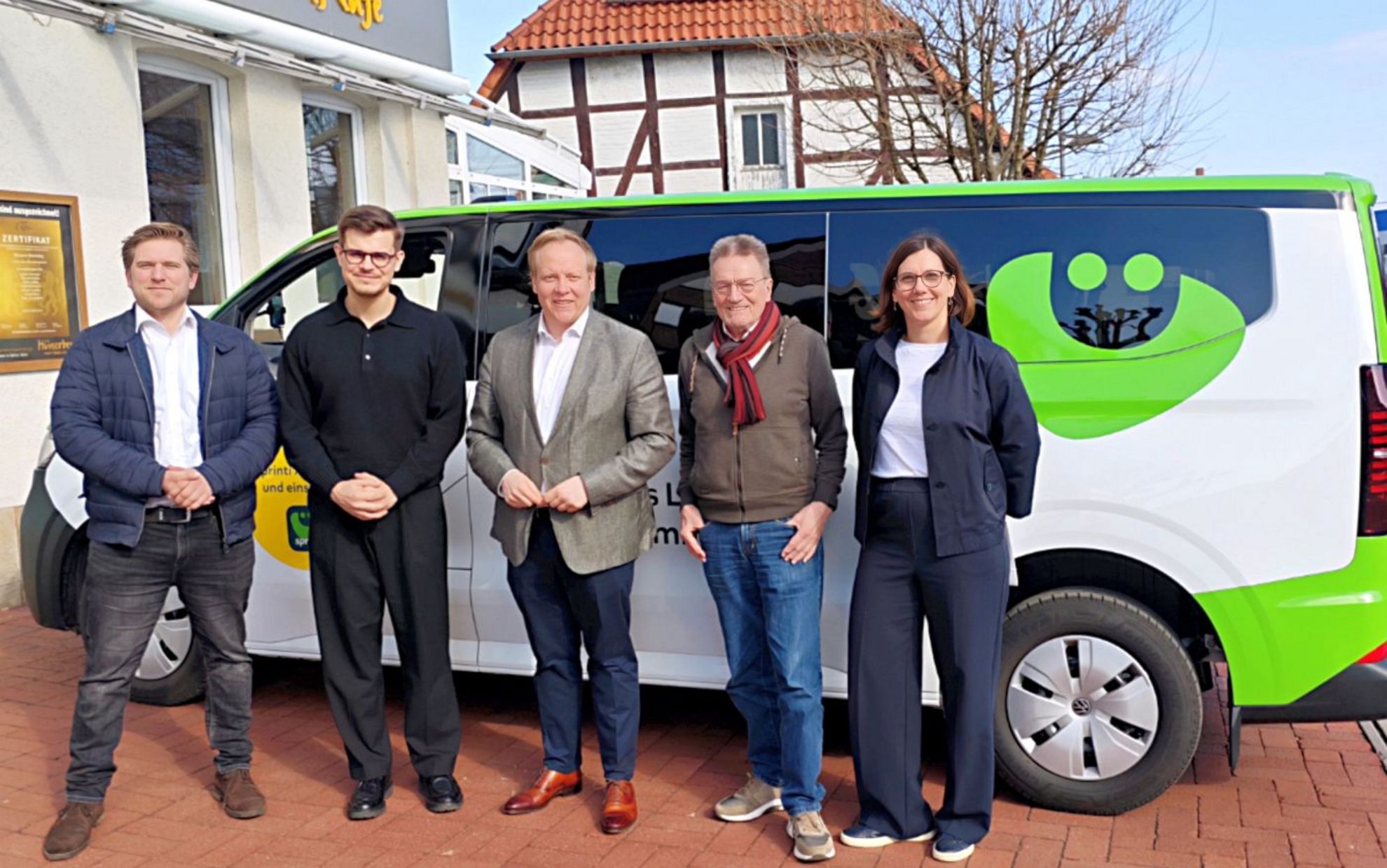 sprinti in Barsinghausen: Bundestagsabgeordneter informiert sich über On-Demand-Verkehr. (v.l.) Sebastian Offermann (Region Hannover), Nils Köster (Geschäftsführer Via), Bundestagsabgeordneter Tilman Kuban, Helmut Lübeck (CDU-Fraktion Region Hannover) und Szilvia Kalmar (Via).