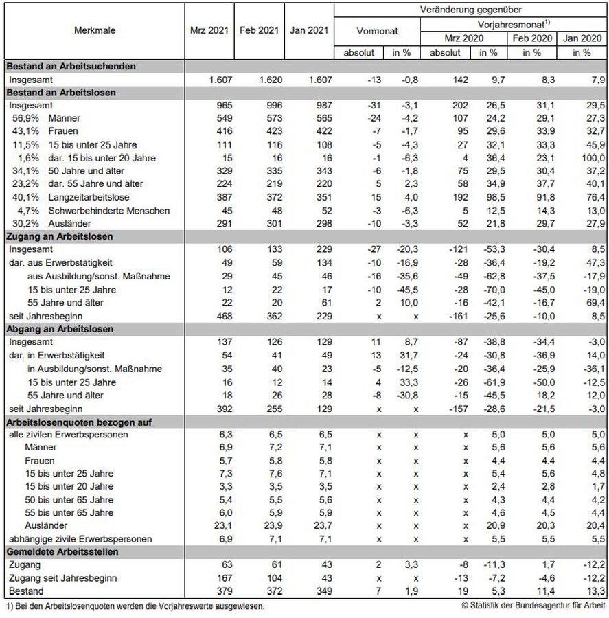 Die Arbeitslosigkeit hat sich im Rechtskreis SGB II von Februar auf März um 15 auf 542 Personen verringert. Das waren 84 Arbeitslose mehr als vor einem Jahr. Die anteilige SGB II-Arbeitslosenquote auf Basis aller zivilen Erwerbspersonen betrug im März 3,6%; vor einem Jahr belief sie sich auf 3,0%. Dabei meldeten sich 41 Personen (neu oder erneut) arbeitslos, 92 weniger als vor einem Jahr. Gleichzeitig beendeten 72 Personen ihre Arbeitslosigkeit, 39 weniger als vor einem Jahr. Seit Beginn des Jahres gab es 183 Arbeitslosmeldungen, das ist ein Minus von 126 im Vergleich zum Vorjahreszeitraum; dem stehen 186 Abmeldungen von Arbeitslosen gegenüber (–84).