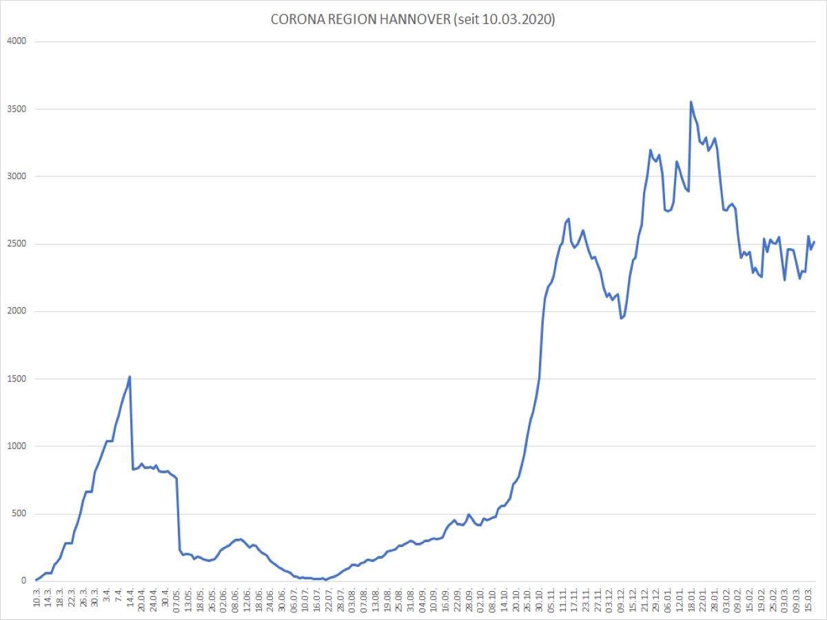 Die Region Hannover hat seit Auftreten der ersten Corona-Infektion insgesamt 34.586 Menschen registriert, die sich in der Region mit dem Coronavirus infiziert haben. Davon sind zum heutigen Stand 32.201 Personen als genesen aufgeführt. 871 Menschen sind infolge einer nachgewiesenen oder mutmaßlichen Corona-Infektion in der Region verstorben; der Altersmedian der Verstorbenen liegt bei 85 Jahren. Somit sind zum jetzigen Zeitpunkt 2514 Menschen in der Region infiziert.