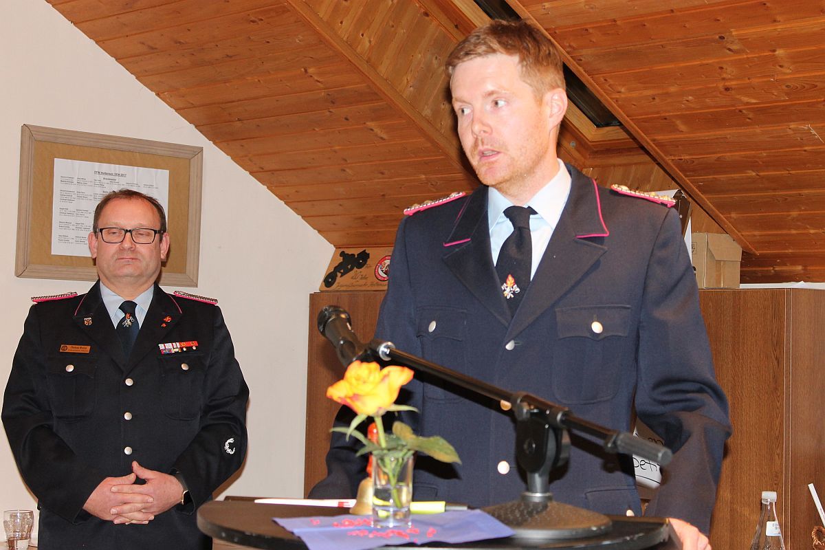 Highlight des Abends war für die 149 Kameraden starke Wehr die Beförderungen. In diesem Jahr wurden Juri Svibovic und Kevin Bauer nach erfolgreicher Prüfung der Truppmann-2-Ausbildung zu Feuerwehrmännern befördert.