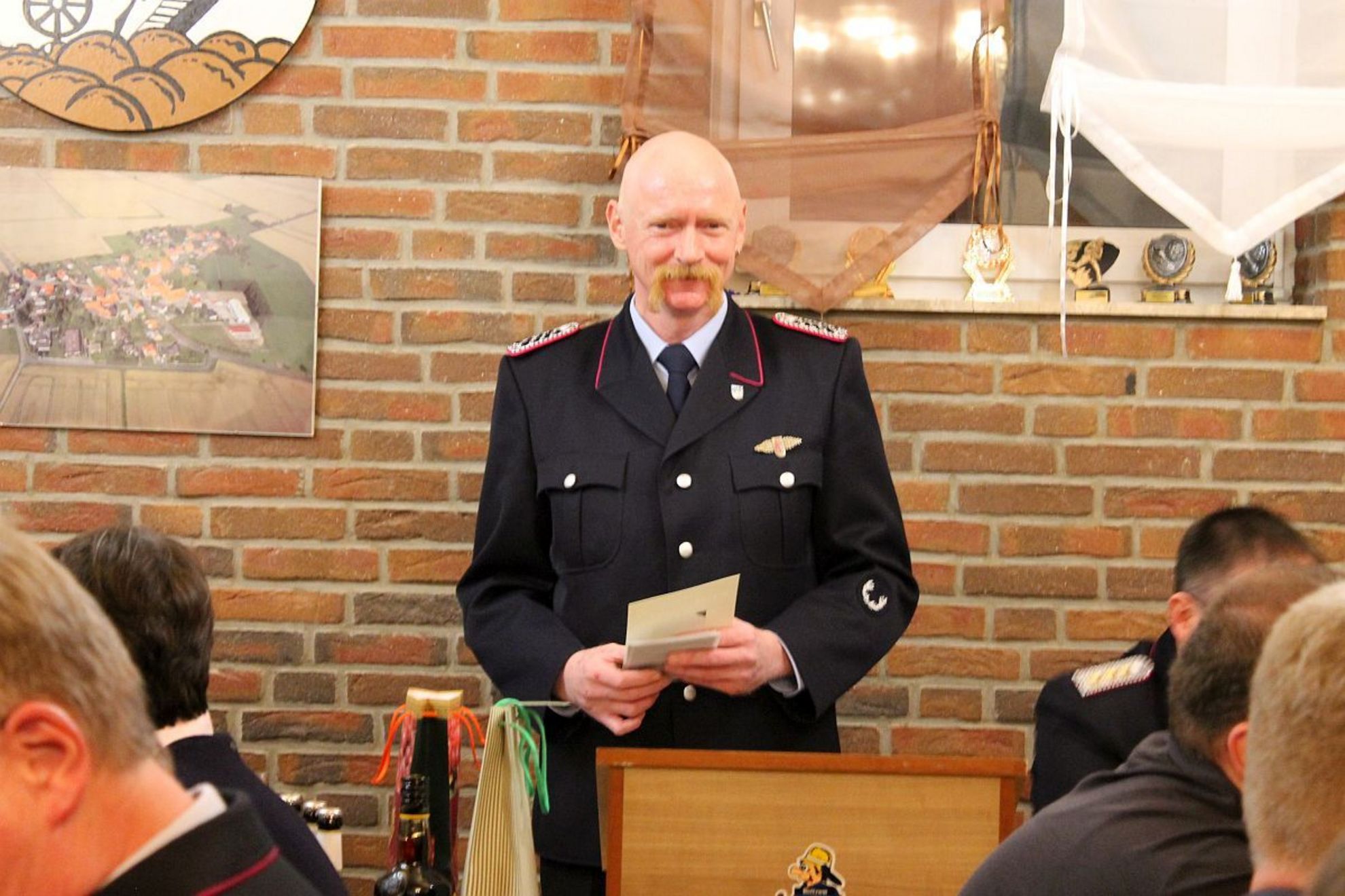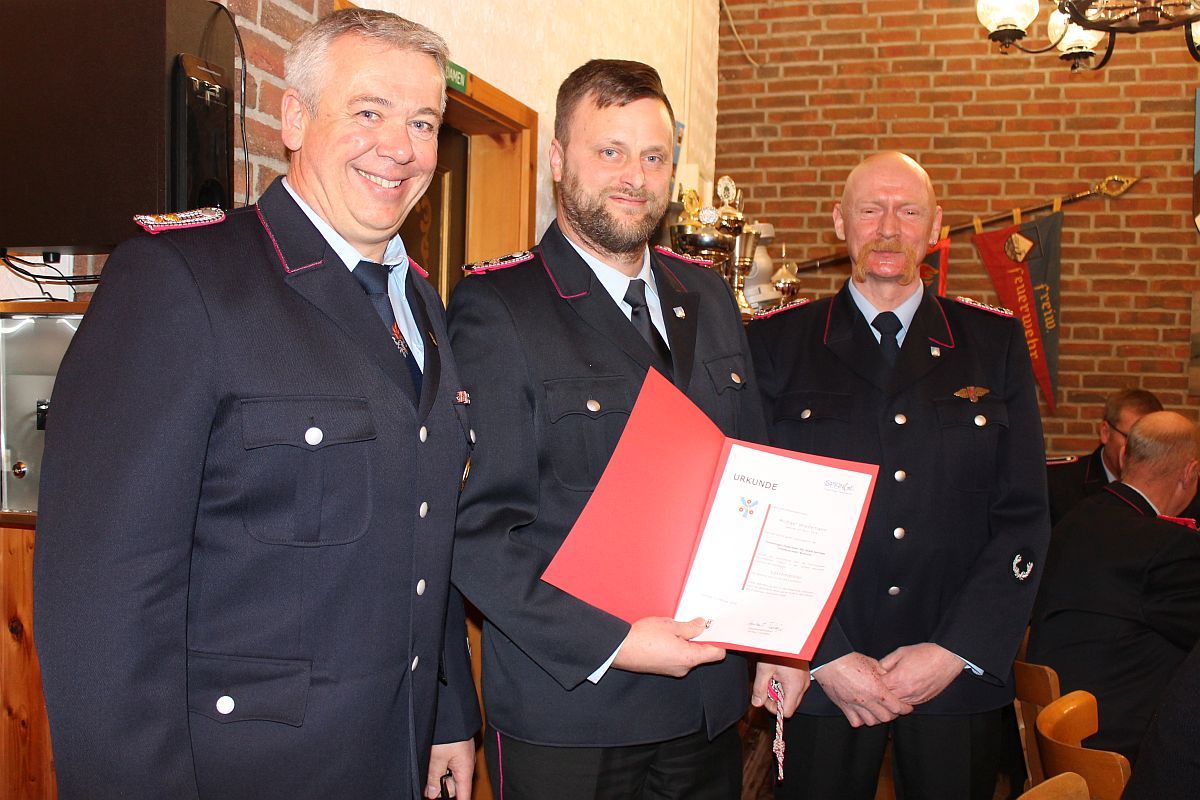 Im Anschluss folgte das Highlight des Abends: Die Ernennungen, Beförderungen und Ehrungen. Die Neubürger Melanie Lange und Nicolai Pukowski wurden zu Feuerwehrmännern ernannt. René Sett, Jannis Lehmann, Marcel Bauer und Dirk Rocks wurden zu Oberfeuerwehrmännern befördert, Marcel Mielcarek zum Feuerwehrmann. Michael Wiedemann trägt von nun an den Dienstgrad Löschmeister. Für 25 Jahre Mitgliedschaft wurden Erika Rocks, Markus Langer und Ulf Nargosen geehrt.
